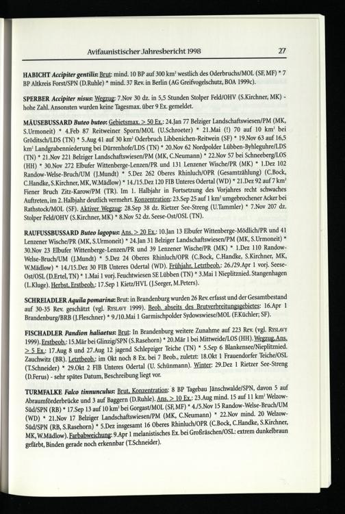 HABICHT Accipiter gentilis : Brut: mind. 10 BP auf 300 km? westlich des Oderbruchs/MOL(SE MF)* 7 BP Altkreis Forst/SPN (D.Ruhle)* mind. 37 Rev. in Berlin (AG Greifvogelschutz, BOA 1999c).