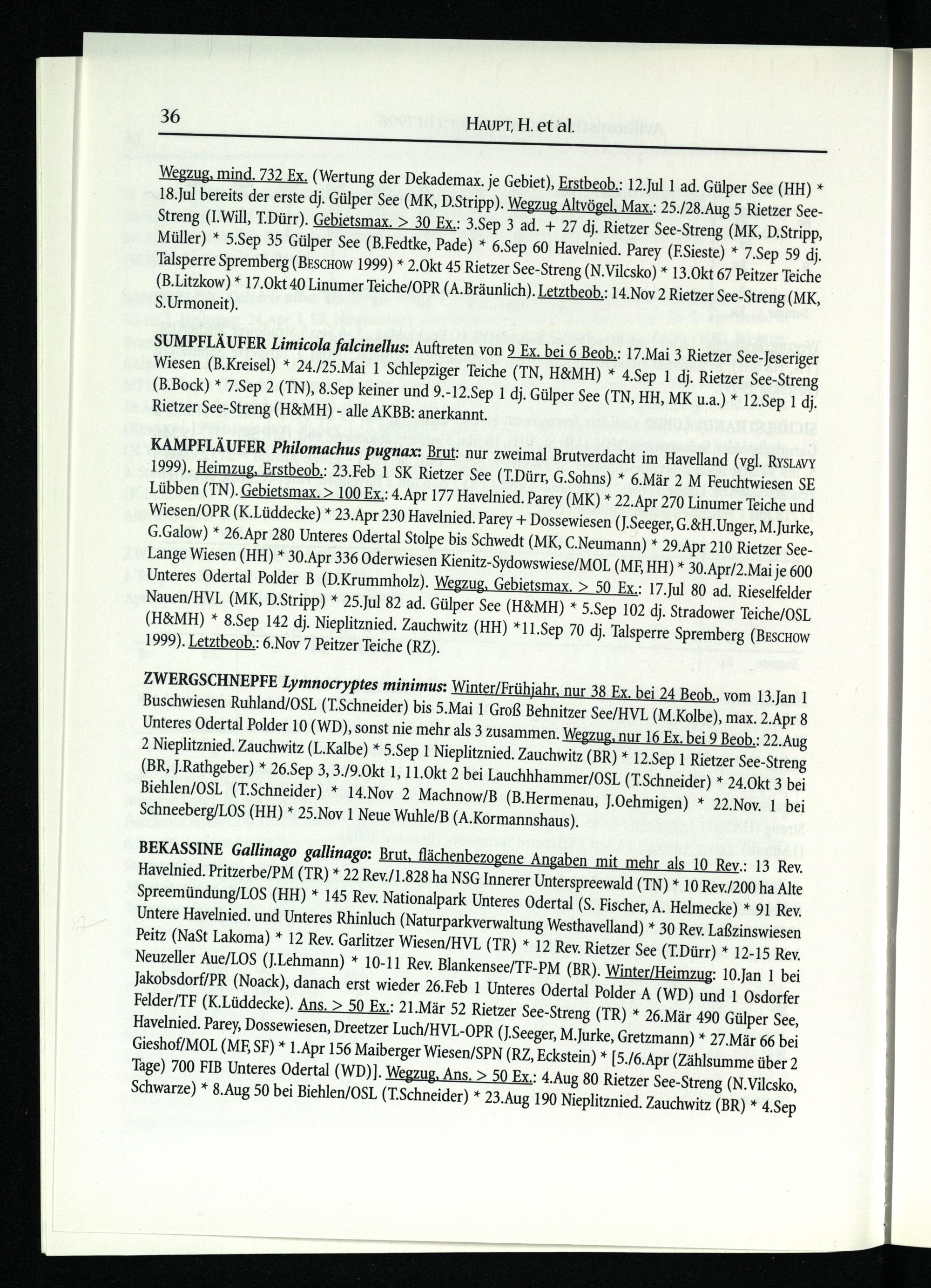 KAMPFLÄUFER Philomachus Pugnax: Brut: nur zweimal Brutverdacht im Havelland(vgl. RysLAvy 1999). Heimzug, Erstbeob.: 23.Feb 1 SK Rietzer See(T.Dürr, G.Sohns)* 6.Mär 2 M Feuchtwiesen SE Lübben(TN). Gebietsmax.> 100 Ex.: 4.Apr 177 Havelnied. Parey (MK)* 22.Apr 270 Linumer Teiche und Wiesen/OPR (K.Lüddecke)* 23.Apr 230 Havelnied. Parey+ Dossewiesen(J.Seeger, G.&H.Unger, M.Jurke, G.Galow)* 26.Apr 280 Unteres Odertal Stolpe bis Schwedt (MK, C.Neumann)* 29.Apr 210 Rietzer SeeLange Wiesen(HH)* 30.Apr 336 Oderwiesen Kienitz-Sydowswiese/MOL(MEHH)* 30.Apr/2.Mai je 600 Unteres Odertal Polder B (D.Krummholz). Wegzug, Gebietsmax.> 50 Ex.: 17.Jul 80 ad. Rieselfelder Nauen/HVL (MK, D.Stripp)* 25.Jul 82 ad. Gülper See(H&MH)* 5.Sep 102 dj. Stradower Teiche/OSL (H&MH)* 8.Sep 142 dj. Nieplitznied. Zauchwitz (HH )*11.Sep 70 dj. Talsperre Spremberg (BEscHow