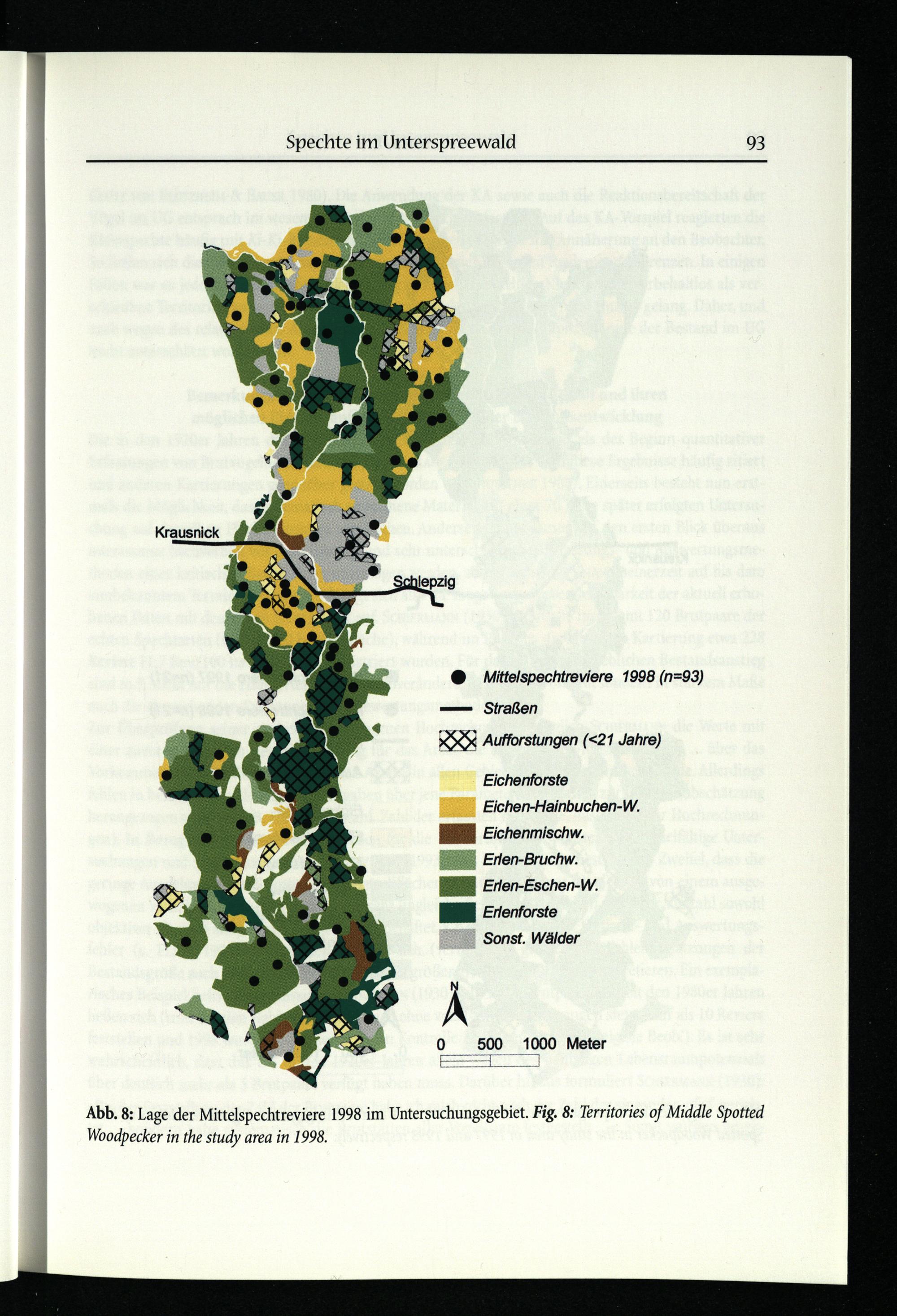 Abb. 8: Lage der Mittelspechtreviere 1998 im Untersuchungsgebiet. Fig. 8: Territories of Middle Spotted Woodpecker in the study area in 1998.