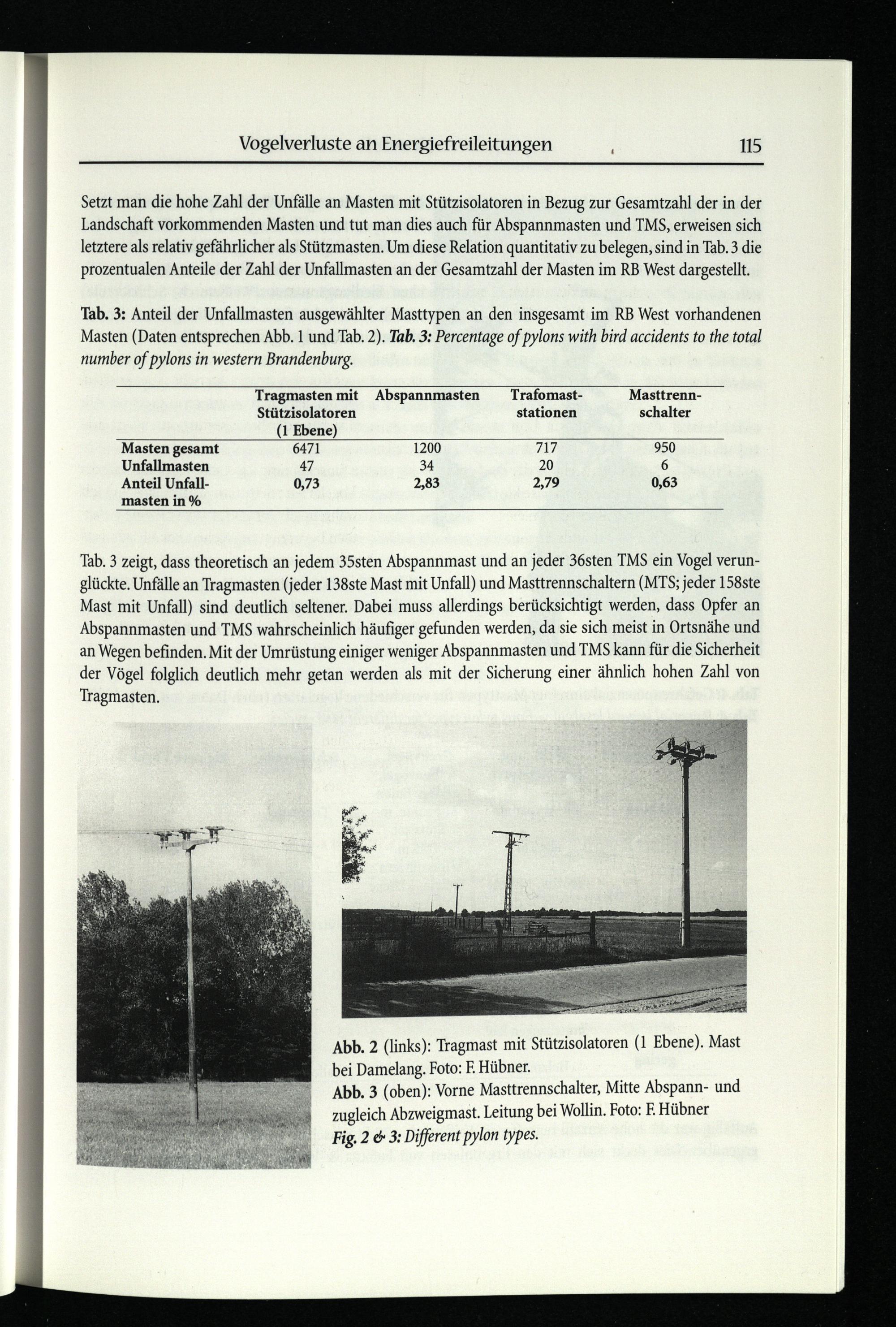 Tab. 3: Anteil der Unfallmasten ausgewählter Masttypen an den insgesamt im RB West vorhandenen Masten(Daten entsprechen Abb. 1 und Tab. 2). Tab. 3: Percentage of pylons with bird accidents to the total number of pylons in western Brandenburg .