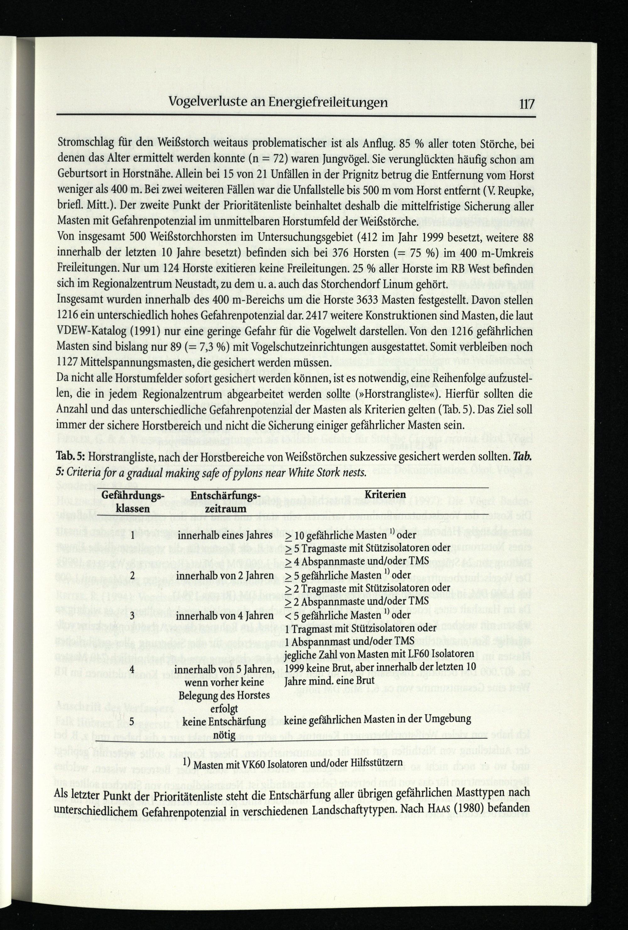 Tab. 5: Horstrangliste, nach der Horstbereiche von Weißstörchen sukzessive gesichert werden sollten. Tab, 5: Criteria for a gradual making safe of pylons near White Stork nests.
