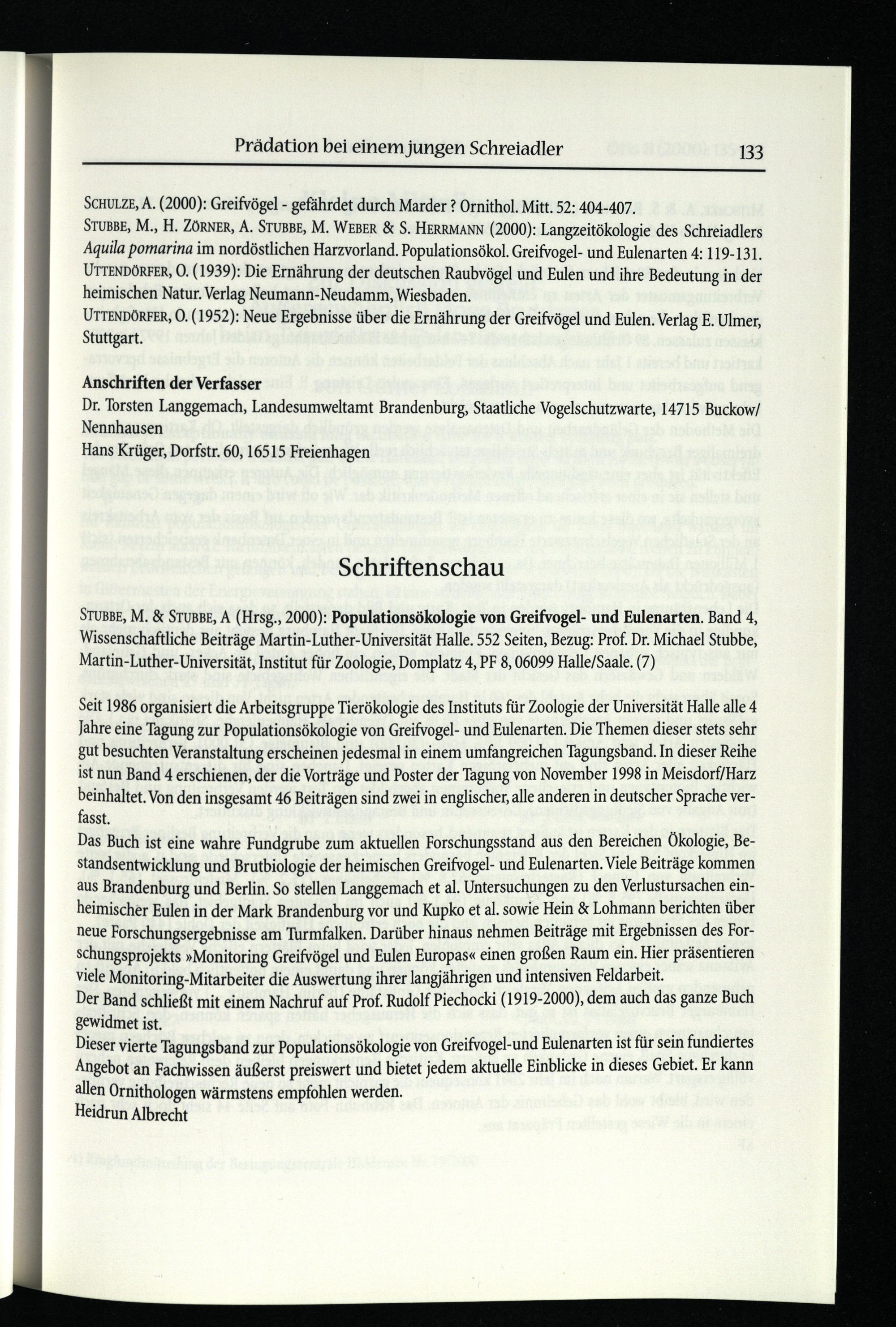 STUBBE, M.& STUBBE, A(Hrsg. , 2000): Populationsökologie von Greifvogel- und Eulenarten. Band 4, Wissenschaftliche Beiträge Martin-Luther-Universität Halle. 552 Seiten, Bezug: Prof. Dr. Michael Stubbe, Martin-Luther-Universität , Institut für Zoologie, Domplatz 4, PF 8, 06099 Halle/Saale. (7)