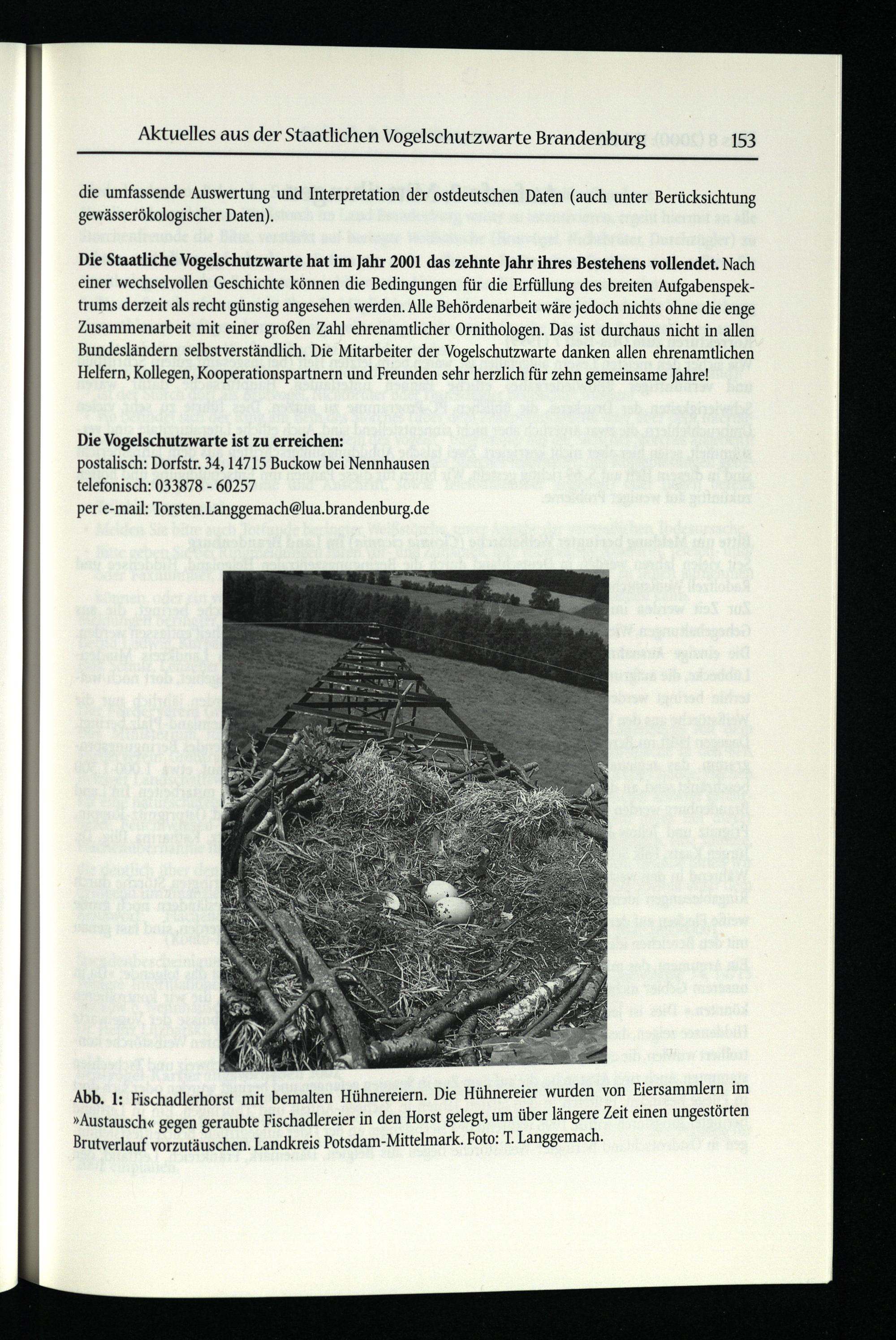 Die Staatliche Vogelschutzwarte hat im Jahr 2001 das zehnte Jahr ihres Bestehens vollendet. Nach einer wechselvollen Geschichte können die Bedingungen für die Erfüllung des breiten Aufgabenspektrums derzeit als recht günstig angesehen werden. Alle Behördenarbeit wäre jedoch nichts ohne die enge Zusammenarbeit mit einer großen Zahl ehrenamtlicher Ornithologen. Das ist durchaus nicht in allen Bundesländern selbstverständlich. Die Mitarbeiter der Vogelschutzwarte danken allen ehrenamtlichen Helfern, Kollegen, Kooperationspartnern und Freunden sehr herzlich für zehn gemeinsame Jahre!