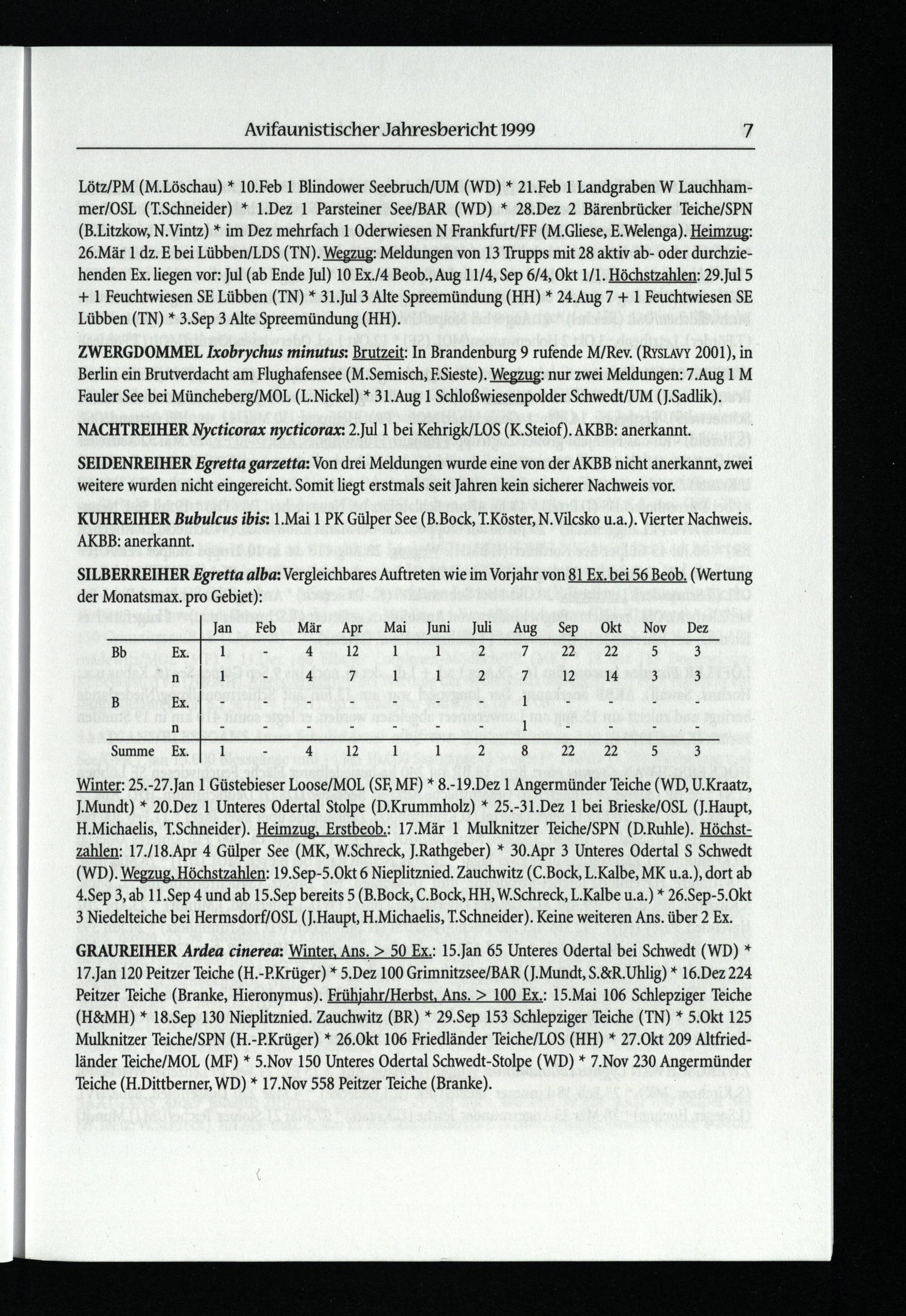 ZWERGDOMMEL Ixobrychus minutus: Brutzeit: In Brandenburg 9 rufende M/Rev.(RysLAvY 2001), in Berlin ein Brutverdacht am Flughafensee(M.Semisch, ESieste). Wegzug: nur zwei Meldungen: 7.Aug 1 M Fauler See bei Müncheberg/MOL (L.Nickel)* 31.Aug 1 Schloßwiesenpolder Schwedt/UM (J.Sadlik).
