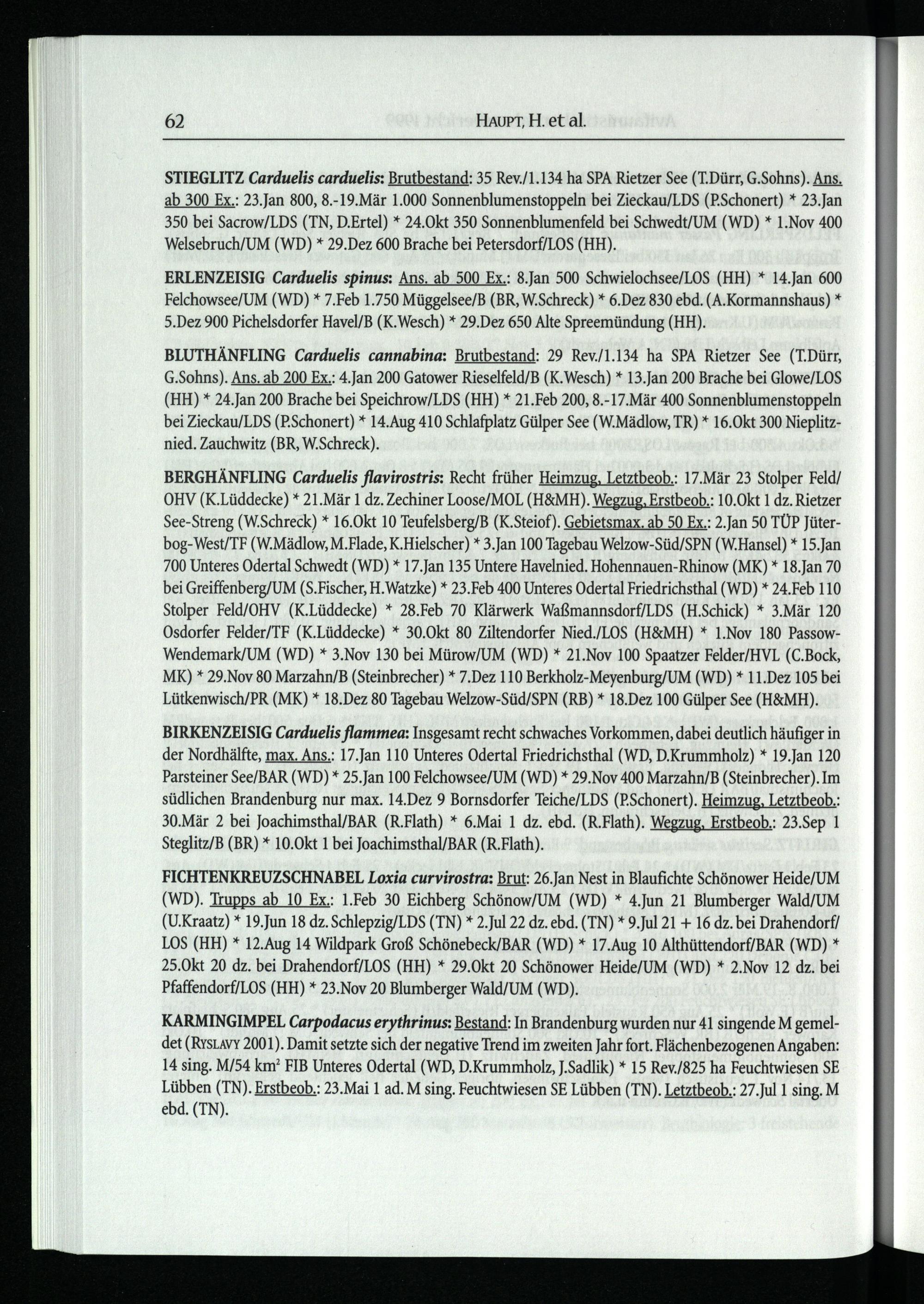BLUTHÄNFLING Carduelis cannabina: Brutbestand: 29 Rev./1.134 ha SPA Rietzer See(T.Dürr, G.Sohns). Ans. ab 200 Ex.: 4.Jan 200 Gatower Rieselfeld/B(K.Wesch)* 13.Jan 200 Brache bei Glowe/LOS (HH)* 24.Jan 200 Brache bei Speichrow/LDS (HH )* 21.Feb 200, 8.-17.Mär 400 Sonnenblumenstoppeln bei Zieckau/LDS (P.Schonert)* 14.Aug 410 Schlafplatz Gülper See(W.Mädlow, TR)* 16.Okt 300 Nieplitznied. Zauchwitz (BR , W.Schreck).