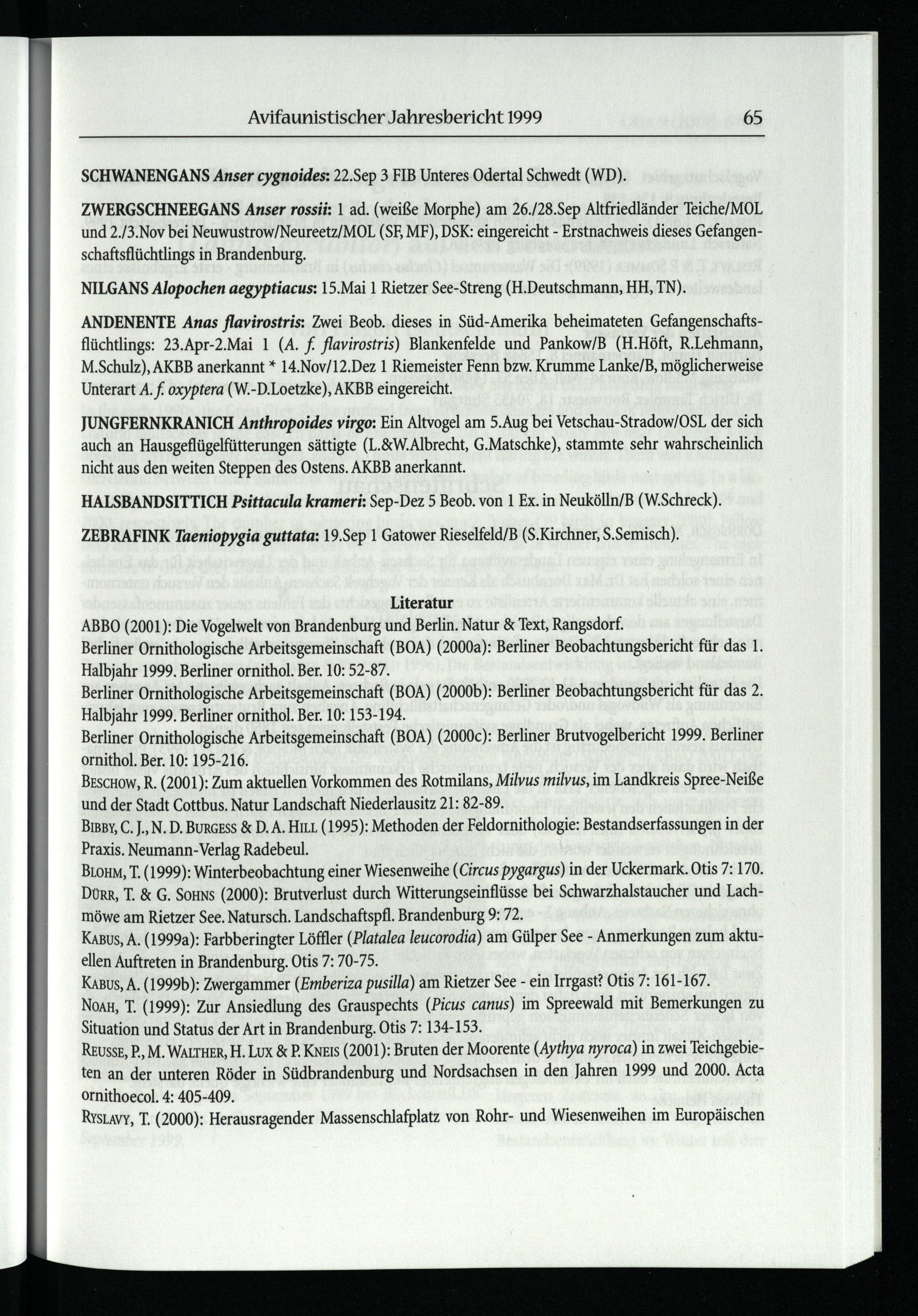 Literatur ABBO(2001): Die Vogelwelt von Brandenburg und Berlin . Natur& Text, Rangsdorf . Berliner Ornithologische Arbeitsgemeinschaft(BOA)(2000a): Berliner Beobachtungsbericht für das 1.