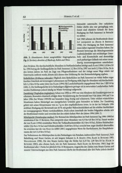 chen Struktur. Die durchschnittliche Abundanz in Parklandschaften beträgt nach FLADE(1994) 2,8 Rev./10 ha. 1994 betrug die Siedlungsdichte im Park Sanssouci 3,2 Rev./10 ha, 1997 nur noch 2,5 Rev./10 ha. Da in den letzten Jahren im Park im Zuge von Pflegemaßnahmen und der Anlage neuer Wege relativ viel Unterwuchs entfernt wurde, könnte sich daraus eine Erklärung für den Bestandsrückgang ergeben. Rotkehlchen(Erithacus rubecula): Obgleich dem Rotkehlchen im Park Sanssouci an vielen Stellen sogar feuchtes Unterholz als bevorzugter Lebensraum zur Verfügung steht, liegt die Abundanz mit durchschnittlich 1,2 Rev./10 ha unter dem von FLADE(1994) für Landschaftsparks angegebenen Wert von 3 BP/10 ha (Abb. 2). Die Siedlungsdichte ist in Parkanlagen allgemein geringer als in naturnahen Landschaften. Dafür werden Parkbiotope jedoch häufig im Winter bevorzugt aufgesucht. Zaunkönig(Troglodytes troglodytes): Schon von 1994 zu 1995 war eine Abnahme der Zaunkönigreviere zu erkennen. Besonders drastisch erfolgte diese Verminderung der Revierzahl von 9 im Jahre 1995 auf 5 im Jahre 1996. Der Winter 1995/96 war besonders lang, frostig.und schneearm. Unter solchen winterlichen Situationen haben Kleinvögel aus energetischen Gründen ganz besonders zu leiden. Der Zaunkönig gehört mit seiner Körpermasse von ca. 7 g zu den empfindlicheren Arten. So ist der im Frühjahr 1996 sichtbare Rückgang der Revierzahl um 45% mit großer Wahrscheinlichkeit auf die erhöhte Sterblichkeit im vorangegangenen Winter zurückzuführen. Doch schon innerhalb der beiden Folgejahre erholte sich der Brutbestand wieder und erreichte fast den relativ hohen Wert des Jahres 1994(Abb. 2). Mittelspecht(Dendrocopus medius ): Der Bestand des Mittelspechtes im Park Sanssouci lag 1996-1998 bei mindestens 8 bis 13 Revieren. Dies entspricht einer Abundanz von 0,5 bis 0,8 Rev./10 ha. Damit werden die von FLADE(1994) ermittelten Werte für Tieflandbuchenwälder(0,5 Rev./10 ha), Eichen-Hainbuchenwälder(0,6 Rev./10 ha) und Erlenbruchwälder(0,08 Rev./10 ha) erreicht bzw. sogar deutlich übertroffen. Sie erreichen fast die von NoaAH(in ABBO 2001) angegebenen Werte für Hartholzauen, des Hauptlebensraums der Art(1,0 Rev./10 ha). Das Vorkommen des Mittelspechtes in den Parkanlagen von Potsdam , insbesondere Park Sanssouci , Park Babelsberg und Neuer Garten, ist seit langem bekannt(z. B. QUANTZ 1916, KALBE in RUTSCHKE 1983, WALLSCHLÄGER 1998). Für den Neuen Garten liegt die Dichte bei 0,19 bis 1,09 Rev./10 ha(KALBE in RUTSCHKE 1983), also ebenso hoch, wie im Park Sanssouci. Nach KALBE(in RUTSCHKE 1983) liegt der Brutbestand aller 3 Parks bei jährlich 8 bis 10 Brutpaaren. Angesichts der Zahlen vom Neuen Garten und neuerer Untersuchungen aus dem Park Sanssouci dürfte der Brutbestand aller drei Parks jedoch deutlich