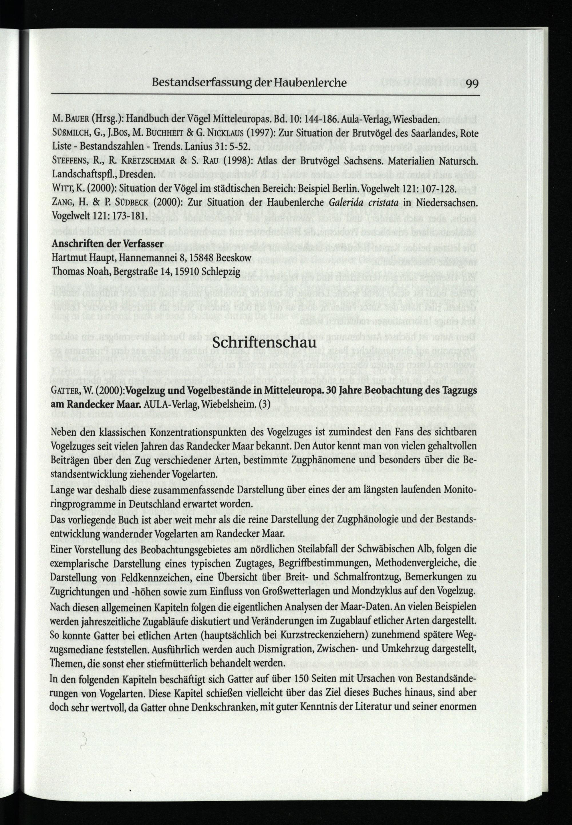 Witt, K.(2000): Situation der Vögel im städtischen Bereich: Beispiel Berlin . Vogelwelt 121: 107-128. ZANG, H.& P. SUDBECK(2000): Zur Situation der Haubenlerche Galerida cristata in Niedersachsen . Vogelwelt 121: 173-181.