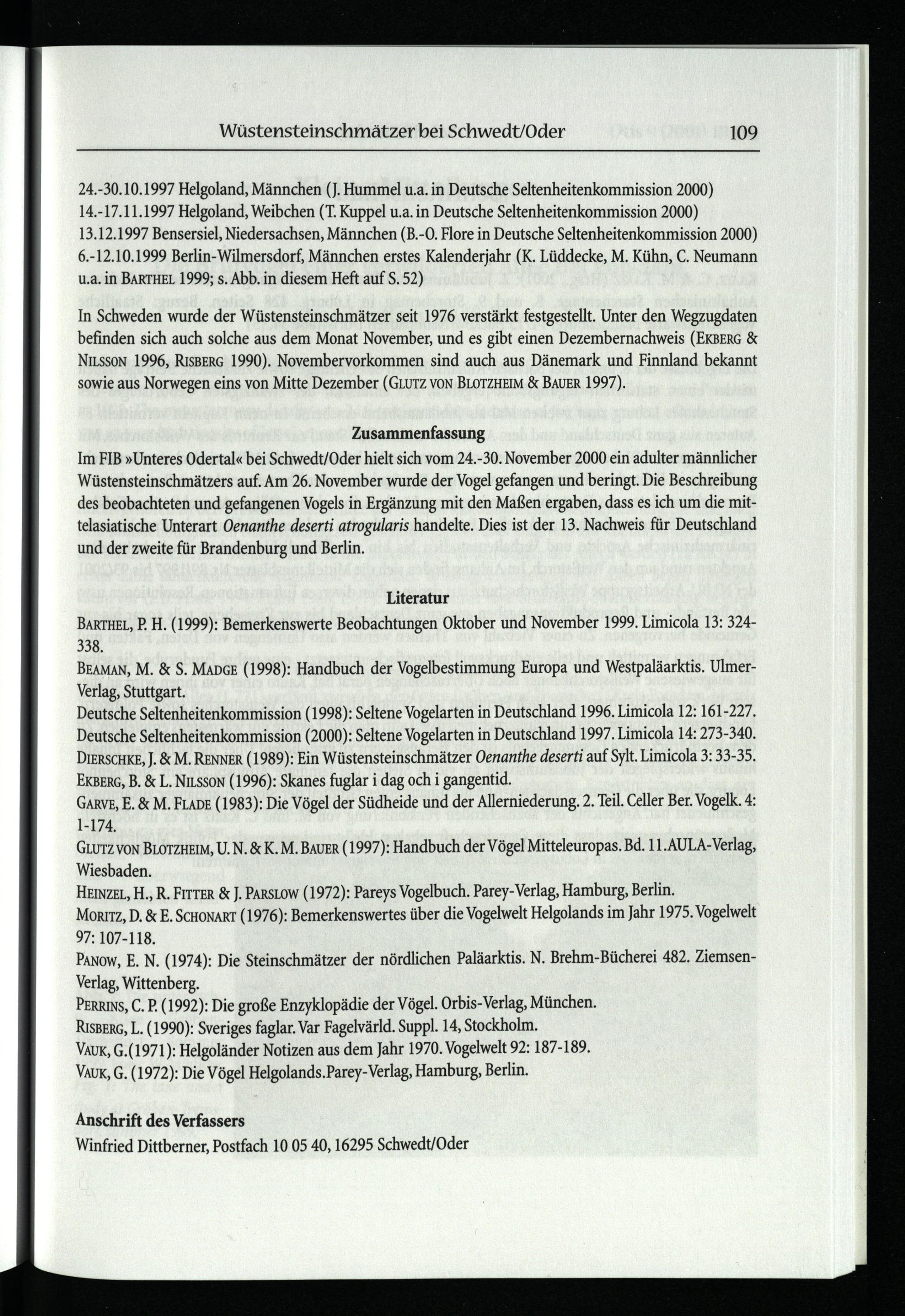 Literatur BARTHEL, P. H.(1999): Bemerkenswerte Beobachtungen Oktober und November 1999. Limicola 13: 324338. BEAMAN, M.& S. MADGE (1998): Handbuch der Vogelbestimmung Europa und Westpaläarktis. UlmerVerlag, Stuttgart . Deutsche Seltenheitenkommission(1998): Seltene Vogelarten in Deutschland 1996. Limicola 12: 161-227. Deutsche Seltenheitenkommission(2000): Seltene Vogelarten in Deutschland 1997. Limicola 14: 273-340. DIERSCHKE, J.& M. RENNER(1989): Ein Wüstensteinschmätzer Oenanthe deserti auf Sylt . Limicola 3: 33-35. EKBERG, B.& L. NILSSON(1996): Skanes fuglar i dag och i gangentid. GARVE, E.& M. FLADE(1983): Die Vögel der Südheide und der Allerniederung. 2. Teil. Celler Ber. Vogelk. 4: 1-174, GLUTZ VON BLOTZHEIM , U. N. & K. M. BAUER(1997): Handbuch der Vögel Mitteleuropas. Bd. 11.AULA-Verlag, Wiesbaden . HeEInzeL, H., R. FITTER& J. PARSLOW(1972): Pareys Vogelbuch. Parey- Verlag, Hamburg , Berlin . Morıtz, D.& E. SCHONART(1976): Bemerkenswertes über die Vogelwelt Helgolands im Jahr 1975. Vogelwelt 97: 107-118. Panow, E. N. (1974): Die Steinschmätzer der nördlichen Paläarktis. N. Brehm-Bücherei 482. ZiemsenVerlag, Wittenberg . PERRINs, C. P.(1992): Die große Enzyklopädie der Vögel. Orbis-Verlag, München . RısBErG, L.(1990): Sveriges faglar. Var Fagelvärld. Suppl. 14, Stockholm . VAUK, G.(1971): Helgoländer Notizen aus dem Jahr 1970. Vogelwelt 92: 187-189. VAUK, G.(1972): Die Vögel Helgolands.Parey-Verlag, Hamburg , Berlin .