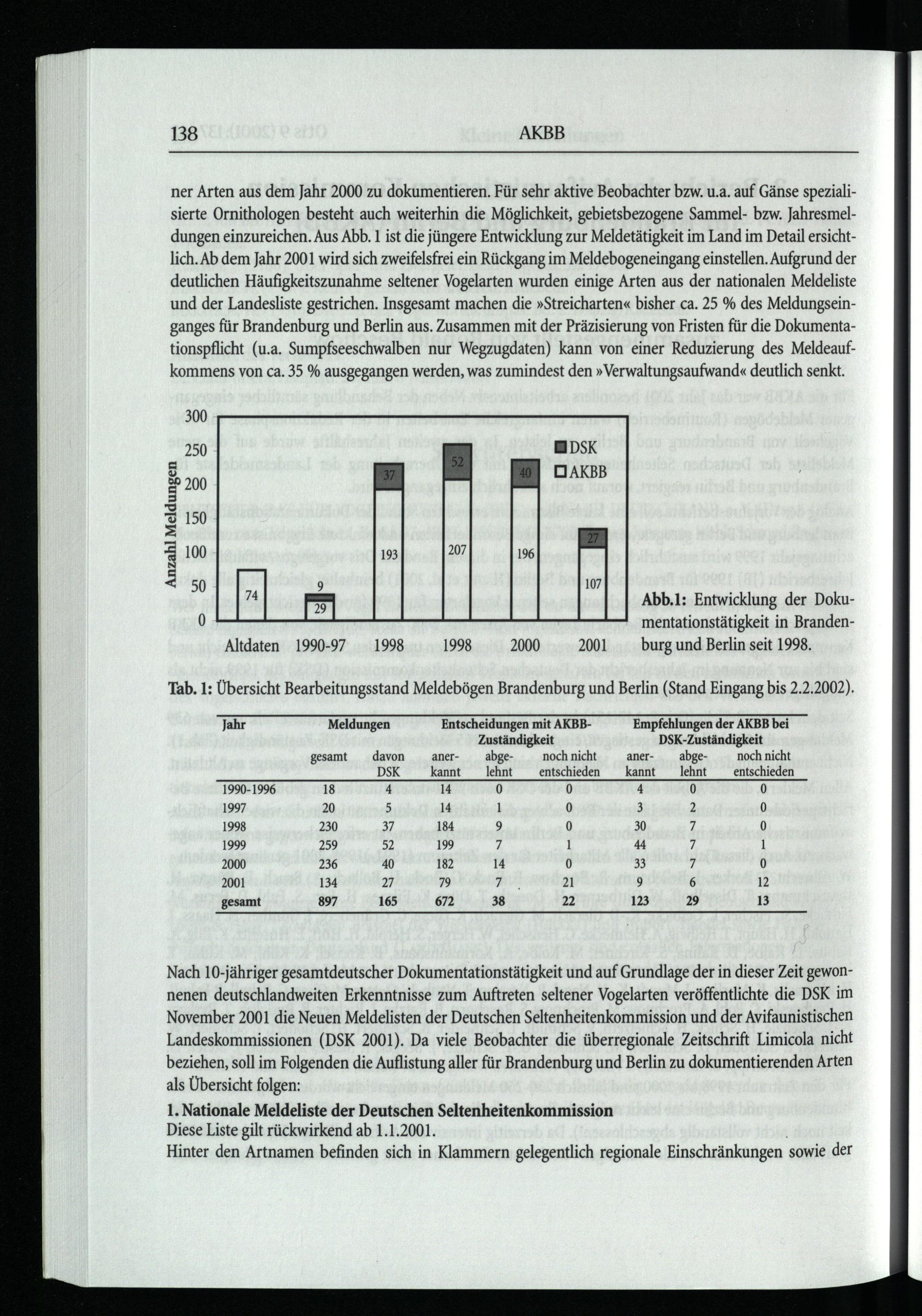 Nach 10-jähriger gesamtdeutscher Dokumentationstätigkeit und auf Grundlage der in dieser Zeit gewonnenen deutschlandweiten Erkenntnisse zum Auftreten seltener Vogelarten veröffentlichte die DSK im November 2001 die Neuen Meldelisten der Deutschen Seltenheitenkommission und der Avifaunistischen Landeskommissionen(DSK 2001). Da viele Beobachter die überregionale Zeitschrift Limicola nicht beziehen, soll im Folgenden die Auflistung aller für Brandenburg und Berlin zu dokumentierenden Arten als Übersicht folgen: