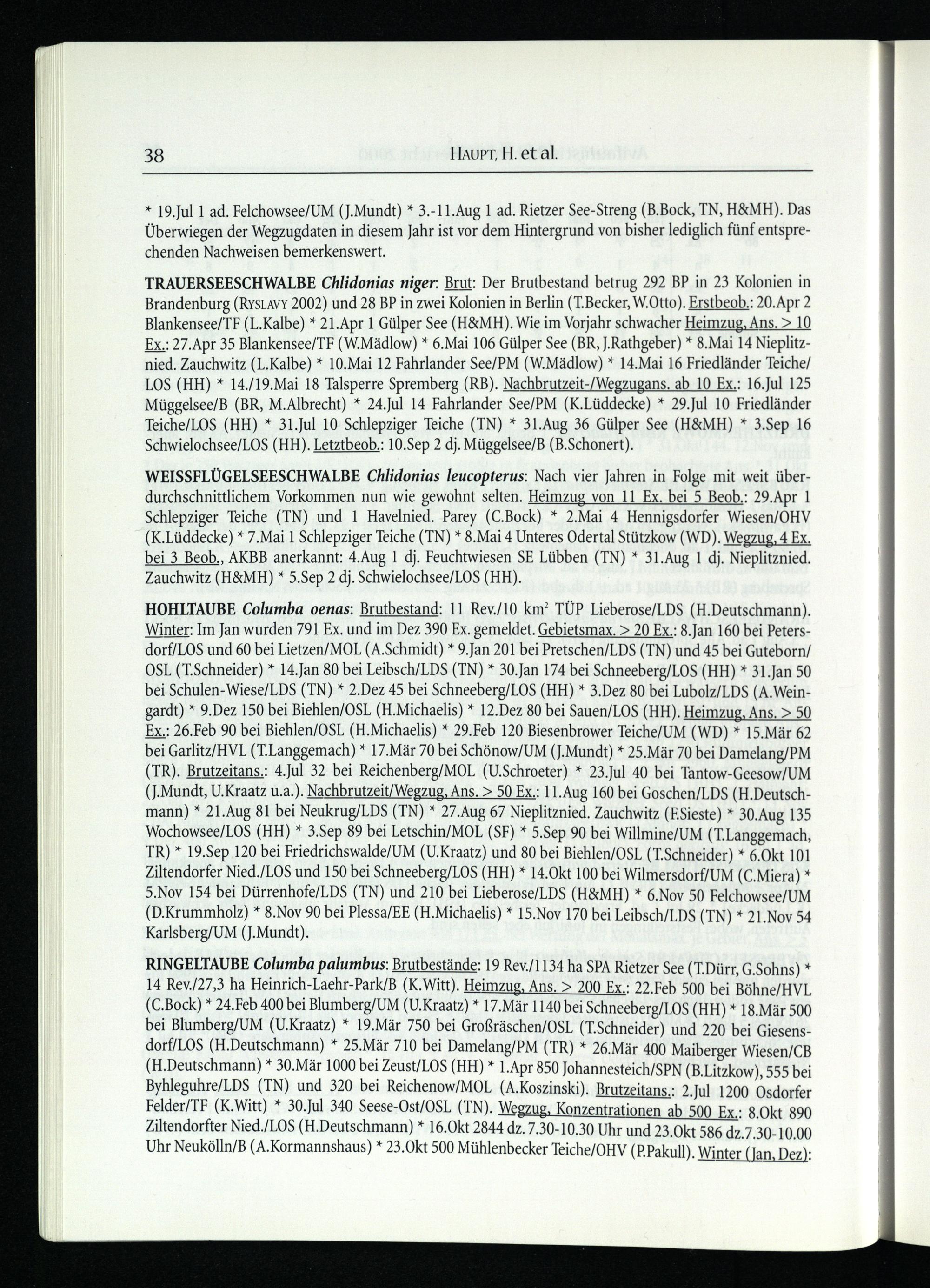HOHLTAUBE Columba oenas: Brutbestand: 11 Rev./10 km? TÜP Lieberose/LDS (H.Deutschmann). Winter: Im Jan wurden 791 Ex. und im Dez 390 Ex. gemeldet. Gebietsmax.> 20 Ex.: 8.Jan 160 bei Petersdorf/LOS und 60 bei Lietzen/MOL (A.Schmidt)* 9.Jan 201 bei Pretschen/LDS (TN) und 45 bei Guteborn/ OSL (T.Schneider)* 14.Jan 80 bei Leibsch/LDS (TN)* 30.Jan 174 bei Schneeberg/LOS (HH)* 31.Jan 50 bei Schulen-Wiese/LDS (TN)* 2.Dez 45 bei Schneeberg/LOS (HH)* 3.Dez 80 bei Lubolz/LDS (A.Weingardt)* 9.Dez 150 bei Biehlen/OSL (H.Michaelis)* 12.Dez 80 bei Sauen/LOS(HH). Heimzug, Ans.> 50 Ex.: 26.Feb 90 bei Biehlen/OSL (H.Michaelis)* 29.Feb 120 Biesenbrower Teiche/UM(WD)* 15.Mär 62 bei Garlitz/HVL (T.Langgemach)* 17.Mär 70 bei Schönow/UM(J.Mundt)* 25.Mär 70 bei Damelang/PM (TR). Brutzeitans.: 4.Jul 32 bei Reichenberg/MOL(U.Schroeter)* 23.Jul 40 bei Tantow-Geesow/UM (J.Mundt, U.Kraatz u.a.). Nachbrutzeit/Wegzug, Ans.> 50 Ex.: 11.Aug 160 bei Goschen/LDS (H.Deutschmann)* 21.Aug 81 bei Neukrug/LDS (TN)* 27.Aug 67 Nieplitznied. Zauchwitz (FESieste)* 30.Aug 135 Wochowsee/LOS(HH)* 3.Sep 89 bei Letschin/MOL (SF)* 5.Sep 90 bei Willmine/UM(T.Langgemach, TR)* 19.Sep 120 bei Friedrichswalde/UM (U.Kraatz) und 80 bei Biehlen/OSL (T.Schneider)* 6.Okt 101 Ziltendorfer Nied. /LOS und 150 bei Schneeberg/LOS (HH)* 14.Okt 100 bei Wilmersdorf/UM (C.Miera)* 5.Nov 154 bei Dürrenhofe/LDS (TN) und 210 bei Lieberose/LDS (H&MH)* 6.Nov 50 Felchowsee/UM (D.Krummholz)* 8.Nov 90 bei Plessa/EE (H.Michaelis)* 15.Nov 170 bei Leibsch/LDS (TN)* 21.Nov 54 Karlsberg/UM(J.Mundt).