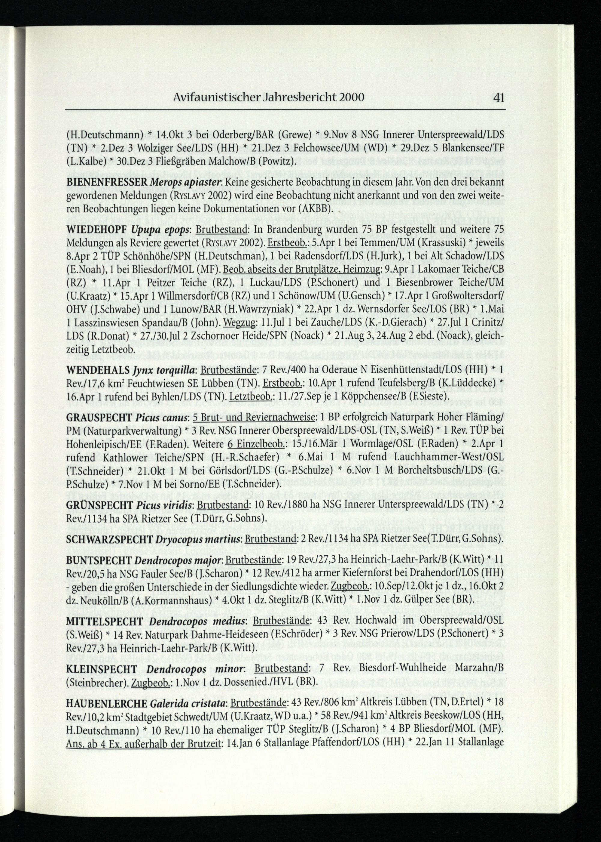 WENDEHALS Jynx torquilla: Brutbestände: 7 Rev./400 ha Oderaue N Eisenhüttenstadt/LOS(HH)* 1 Rev./17,6 km? Feuchtwiesen SE Lübben(TN). Erstbeob.: 10.Apr 1 rufend Teufelsberg/B(K.Lüddecke)* 16.Apr 1 rufend bei Byhlen/LDS (TN). Letztbeob.: 11./27.Sep je 1 Köppchensee/B(FSieste).