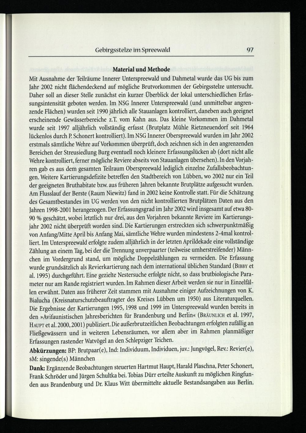 Mit Ausnahme der Teilräume Innerer Unterspreewald und Dahmetal wurde das UG bis zum Jahr 2002 nicht flächendeckend auf mögliche Brutvorkommen der Gebirgsstelze untersucht. Daher soll an dieser Stelle zunächst ein kurzer Überblick der lokal unterschiedlichen Erfassungsintensität geboten werden. Im NSG Innerer Unterspreewald(und unmittelbar angrenzende Flächen) wurden seit 1990 jährlich alle Stauanlagen kontrolliert, daneben auch geeignet erscheinende Gewässerbereiche z.T. vom Kahn aus. Das kleine Vorkommen im Dahmetal wurde seit 1997 alljährlich vollständig erfasst(Brutplatz Mühle Rietzneuendorf seit 1964 lückenlos durch P. Schonert kontrolliert). Im NSG Innerer Oberspreewald wurden im Jahr 2002 erstmals sämtliche Wehre auf Vorkommen überprüft, doch zeichnen sich in den angrenzenden Bereichen der Streusiedlung Burg eventuell noch kleinere Erfassungslücken ab(dort nicht alle Wehre kontrolliert, ferner mögliche Reviere abseits von Stauanlagen übersehen). In den Vorjahren gab es aus dem gesamten Teilraum Oberspreewald lediglich einzelne Zufallsbeobachtungen. Weitere Kartierungsdefizite betreffen den Stadtbereich von Lübben , wo 2002 nur ein Teil der geeigneten Bruthabitate bzw. aus früheren Jahren bekannte Brutplätze aufgesucht wurden. Am Flusslauf der Berste(Raum Niewitz) fand in 2002 keine Kontrolle statt. Für die Schätzung des Gesamtbestandes im UG werden von den nicht kontrollierten Brutplätzen Daten aus den Jahren 1998-2001 herangezogen. Der Erfassungsgrad im Jahr 2002 wird insgesamt auf etwa 8090% geschätzt, wobei letztlich nur drei, aus den Vorjahren bekannte Reviere im Kartierungsjahr 2002 nicht überprüft worden sind. Die Kartierungen erstreckten sich schwerpunktmäßig von Anfang/Mitte April bis Anfang Mai, sämtliche Wehre wurden mindestens 2-4mal kontrolliert. Im Unterspreewald erfolgte zudem alljährlich in der letzten Aprildekade eine vollständige Zählung an einem Tag, bei der die Trennung unverpaarter(teilweise umherstreifender) Männchen im Vordergrund stand, um mögliche Doppelzählungen zu vermeiden. Die Erfassung wurde grundsätzlich als Revierkartierung nach dem international üblichen Standard(BıBBY et al. 1995) durchgeführt. Eine gezielte Nestersuche erfolgte nicht, so dass brutbiologische Parameter nur am Rande registriert wurden. Im Rahmen dieser Arbeit werden sie nur in Einzelfällen erwähnt. Daten aus früherer Zeit stammen mit Ausnahme einiger Aufzeichnungen von K. Bialucha(Kreisnaturschutzbeauftragter des Kreises Lübben um 1950) aus Literaturquellen. Die Ergebnisse der Kartierungen 1995, 1998 und 1999 im Unterspreewald wurden bereits in den»Avifaunistischen Jahresberichten für Brandenburg und Berlin «(BRÄUNLICH et al. 1997, HauPr et al. 2000, 2001) publiziert. Die außerbrutzeitlichen Beobachtungen erfolgten zufällig an Fließgewässern und in weiteren Lebensräumen, vor allem aber im Rahmen planmäßiger Erfassungen rastender Watvögel an den Schlepziger Teichen.