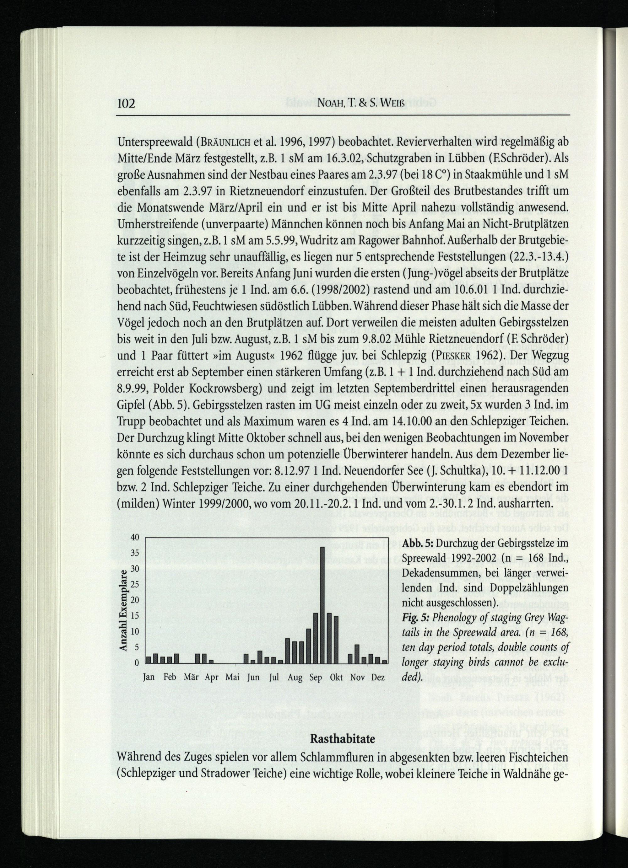 Unterspreewald (BRÄUNLICH et al. 1996, 1997) beobachtet. Revierverhalten wird regelmäßig ab Mitte/Ende März festgestellt, z.B. 1 SM am 16.3.02, Schutzgraben in Lübben (ESchröder). Als große Ausnahmen sind der Nestbau eines Paares am 2.3.97(bei 18 C°) in Staakmühle und 1 sM ebenfalls am 2.3.97 in Rietzneuendorf einzustufen. Der Großteil des Brutbestandes trifft um die Monatswende März/April ein und er ist bis Mitte April nahezu vollständig anwesend. Umkherstreifende(unverpaarte) Männchen können noch bis Anfang Mai an Nicht-Brutplätzen kurzzeitig singen, z.B. 1 sM am 5.5.99, Wudritz am Ragower Bahnhof. Außerhalb der Brutgebiete ist der Heimzug sehr unauffällig, es liegen nur 5 entsprechende Feststellungen(22.3.-13.4.) von Einzelvögeln vor. Bereits Anfang Juni wurden die ersten(Jung-)vögel abseits der Brutplätze beobachtet, frühestens je 1 Ind. am 6.6.(1998/2002) rastend und am 10.6.01 1 Ind. durchziehend nach Süd, Feuchtwiesen südöstlich Lübben . Während dieser Phase hält sich die Masse der Vögel jedoch noch an den Brutplätzen auf. Dort verweilen die meisten adulten Gebirgsstelzen bis weit in den Juli bzw. August, z.B. 1 SM bis zum 9.8.02 Mühle Rietzneuendorf(FE Schröder) und 1 Paar füttert»im August« 1962 flügge juv. bei Schlepzig (PıESKER 1962). Der Wegzug erreicht erst ab September einen stärkeren Umfang(z.B. 1+ 1 Ind. durchziehend nach Süd am 8.9.99, Polder Kockrowsberg) und zeigt im letzten Septemberdrittel einen herausragenden Gipfel(Abb. 5). Gebirgsstelzen rasten im UG meist einzeln oder zu zweit, 5x wurden 3 Ind. im Trupp beobachtet und als Maximum waren es 4 Ind. am 14.10.00 an den Schlepziger Teichen. Der Durchzug klingt Mitte Oktober schnell aus, bei den wenigen Beobachtungen im November könnte es sich durchaus schon um potenzielle Überwinterer handeln. Aus dem Dezember liegen folgende Feststellungen vor: 8.12.97 1 Ind. Neuendorfer See(J. Schultka), 10.+ 11.12.00 1 bzw. 2 Ind. Schlepziger Teiche. Zu einer durchgehenden Überwinterung kam es ebendort im (milden) Winter 1999/2000, wo vom 20.11.-20.2. 1 Ind. und vom 2.-30.1.2 Ind. ausharrten.