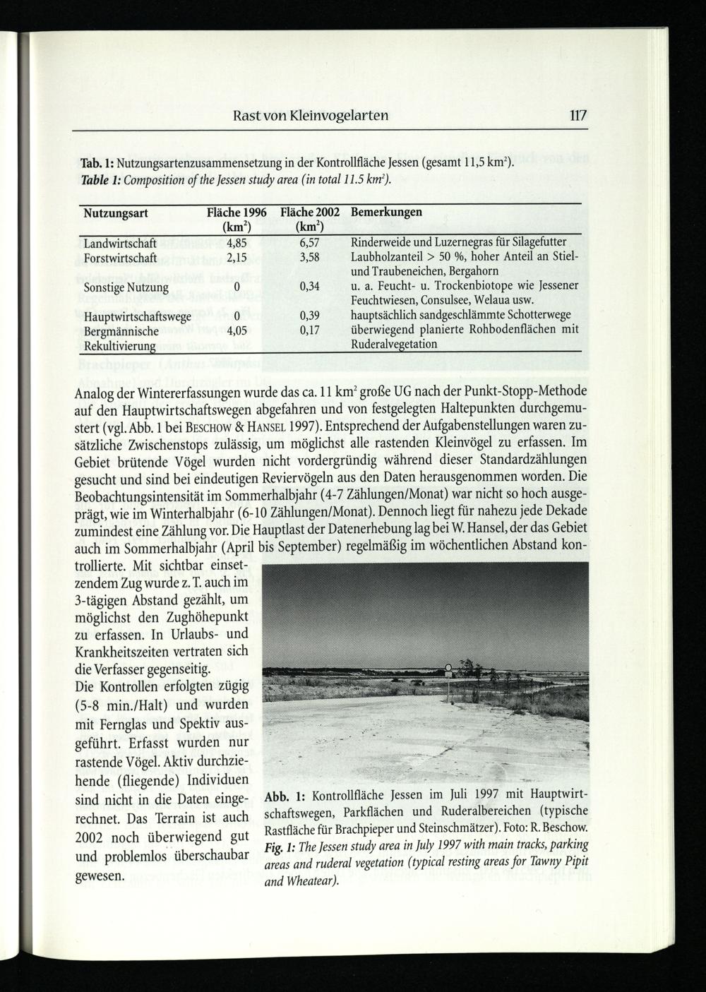 Tab. 1: Nutzungsartenzusammensetzung in der Kontrollfläche Jessen(gesamt 11,5 km”). Table 1: Composition of the Jessen study area(in total 11.5 km’).