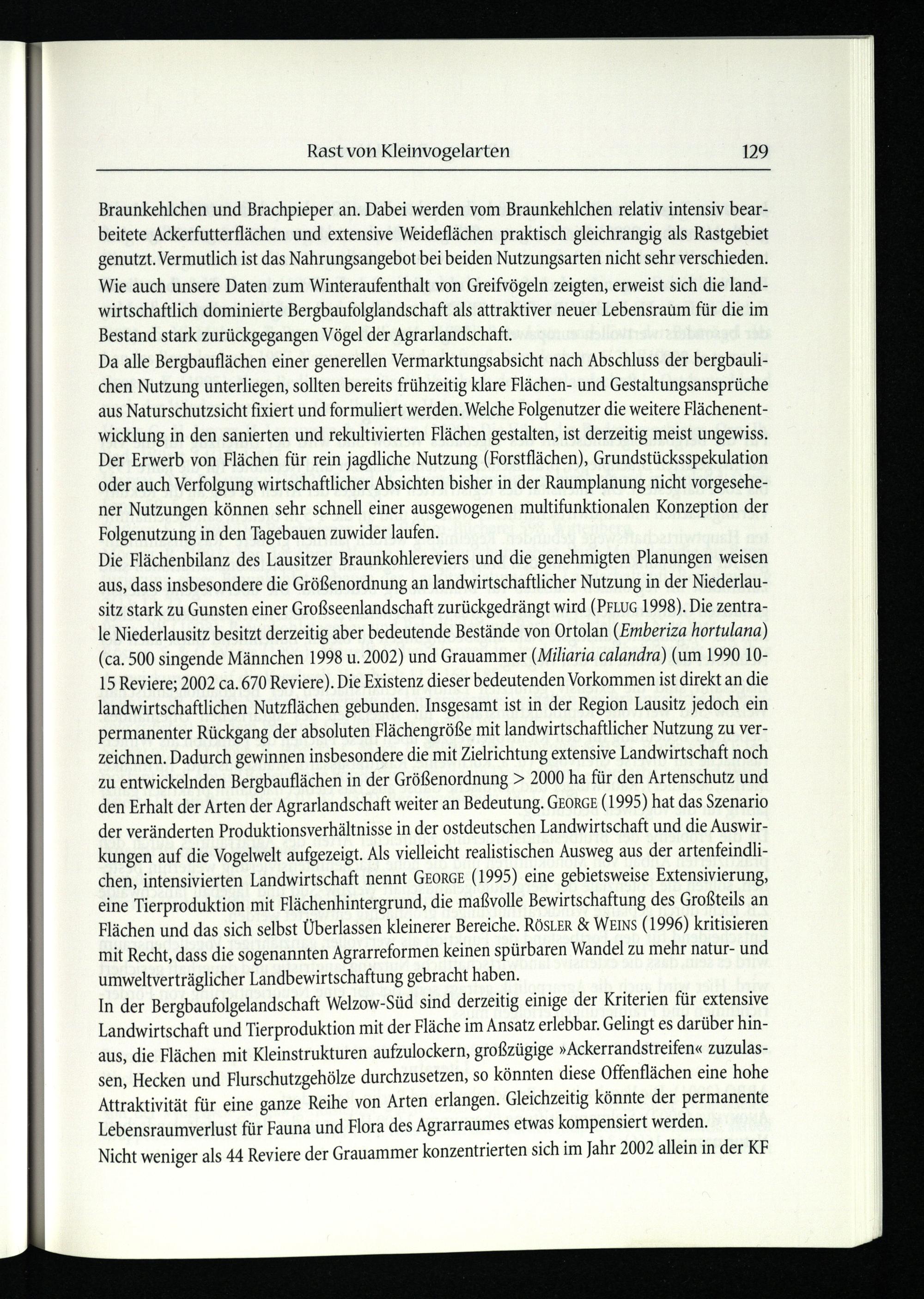 Die Flächenbilanz des Lausitzer Braunkohlereviers und die genehmigten Planungen weisen aus, dass insbesondere die Größenordnung an landwirtschaftlicher Nutzung in der Niederlau sitz stark zu Gunsten einer Großseenlandschaft zurückgedrängt wird(PFLUG 1998). Die zentrale Niederlausitz besitzt derzeitig aber bedeutende Bestände von Ortolan(Emberiza hortulana) (ca. 500 singende Männchen 1998 u. 2002) und Grauammer(Miliaria calandra)(um 1990 1015 Reviere; 2002 ca. 670 Reviere). Die Existenz dieser bedeutenden Vorkommen ist direkt an die landwirtschaftlichen Nutzflächen gebunden. Insgesamt ist in der Region Lausitz jedoch ein permanenter Rückgang der absoluten Flächengröße mit landwirtschaftlicher Nutzung zu verzeichnen. Dadurch gewinnen insbesondere die mit Zielrichtung extensive Landwirtschaft noch zu entwickelnden Bergbauflächen in der Größenordnung> 2000 ha für den Artenschutz und den Erhalt der Arten der Agrarlandschaft weiter an Bedeutung. GEORGE(1995) hat das Szenario der veränderten Produktionsverhältnisse in der ostdeutschen Landwirtschaft und die Auswirkungen auf die Vogelwelt aufgezeigt. Als vielleicht realistischen Ausweg aus der artenfeindlichen, intensivierten Landwirtschaft nennt GEORGE(1995) eine gebietsweise Extensivierung, eine Tierproduktion mit Flächenhintergrund, die maßvolle Bewirtschaftung des Großteils an Flächen und das sich selbst Überlassen kleinerer Bereiche. RÖSLER& WEINs(1996) kritisieren mit Recht, dass die sogenannten Agrarreformen keinen spürbaren Wandel zu mehr natur- und umweltverträglicher Landbewirtschaftung gebracht haben.