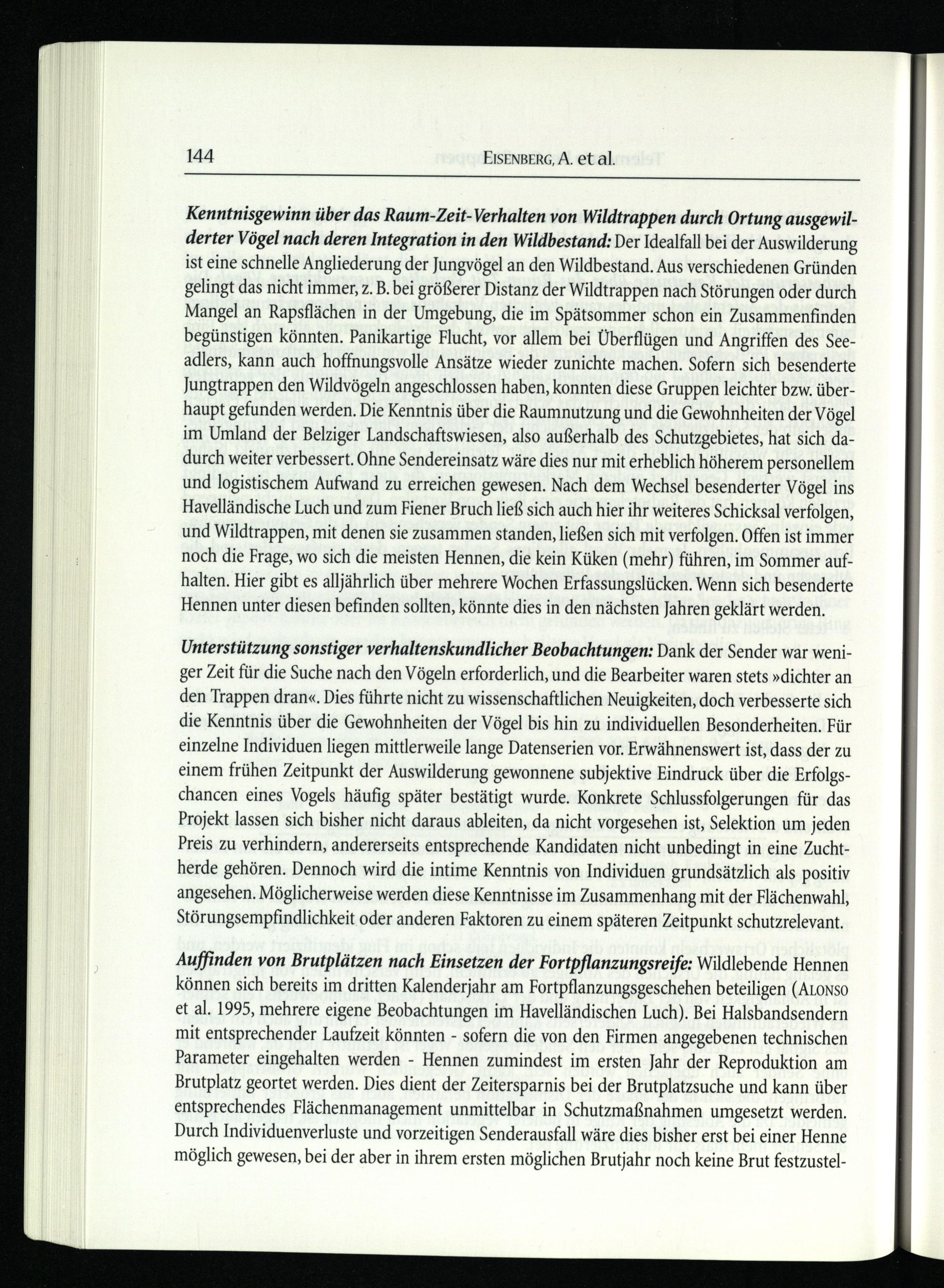 Kenntnisgewinn über das Raum-Zeit-Verhalten von Wildtrappen durch Ortung ausgewilderter Vögel nach deren Integration in den Wildbestand: Der Idealfall bei der Auswilderung ist eine schnelle Angliederung der Jungvögel an den Wildbestand. Aus verschiedenen Gründen gelingt das nicht immer, z. B. bei größerer Distanz der Wildtrappen nach Störungen oder durch Mangel an Rapsflächen in der Umgebung, die im Spätsommer schon ein Zusammenfinden begünstigen könnten. Panikartige Flucht, vor allem bei Überflügen und Angriffen des Seeadlers, kann auch hoffnungsvolle Ansätze wieder zunichte machen. Sofern sich besenderte Jungtrappen den Wildvögeln angeschlossen haben, konnten diese Gruppen leichter bzw. überhaupt gefunden werden. Die Kenntnis über die Raumnutzung und die Gewohnheiten der Vögel im Umland der Belziger Landschaftswiesen, also außerhalb des Schutzgebietes, hat sich dadurch weiter verbessert. Ohne Sendereinsatz wäre dies nur mit erheblich höherem personellem und logistischem Aufwand zu erreichen gewesen. Nach dem Wechsel besenderter Vögel ins Havelländische Luch und zum Fiener Bruch ließ sich auch hier ihr weiteres Schicksal verfolgen, und Wildtrappen, mit denen sie zusammen standen, ließen sich mit verfolgen. Offen ist immer noch die Frage, wo sich die meisten Hennen, die kein Küken(mehr) führen, im Sommer aufhalten. Hier gibt es alljährlich über mehrere Wochen Erfassungslücken. Wenn sich besenderte Hennen unter diesen befinden sollten, könnte dies in den nächsten Jahren geklärt werden.