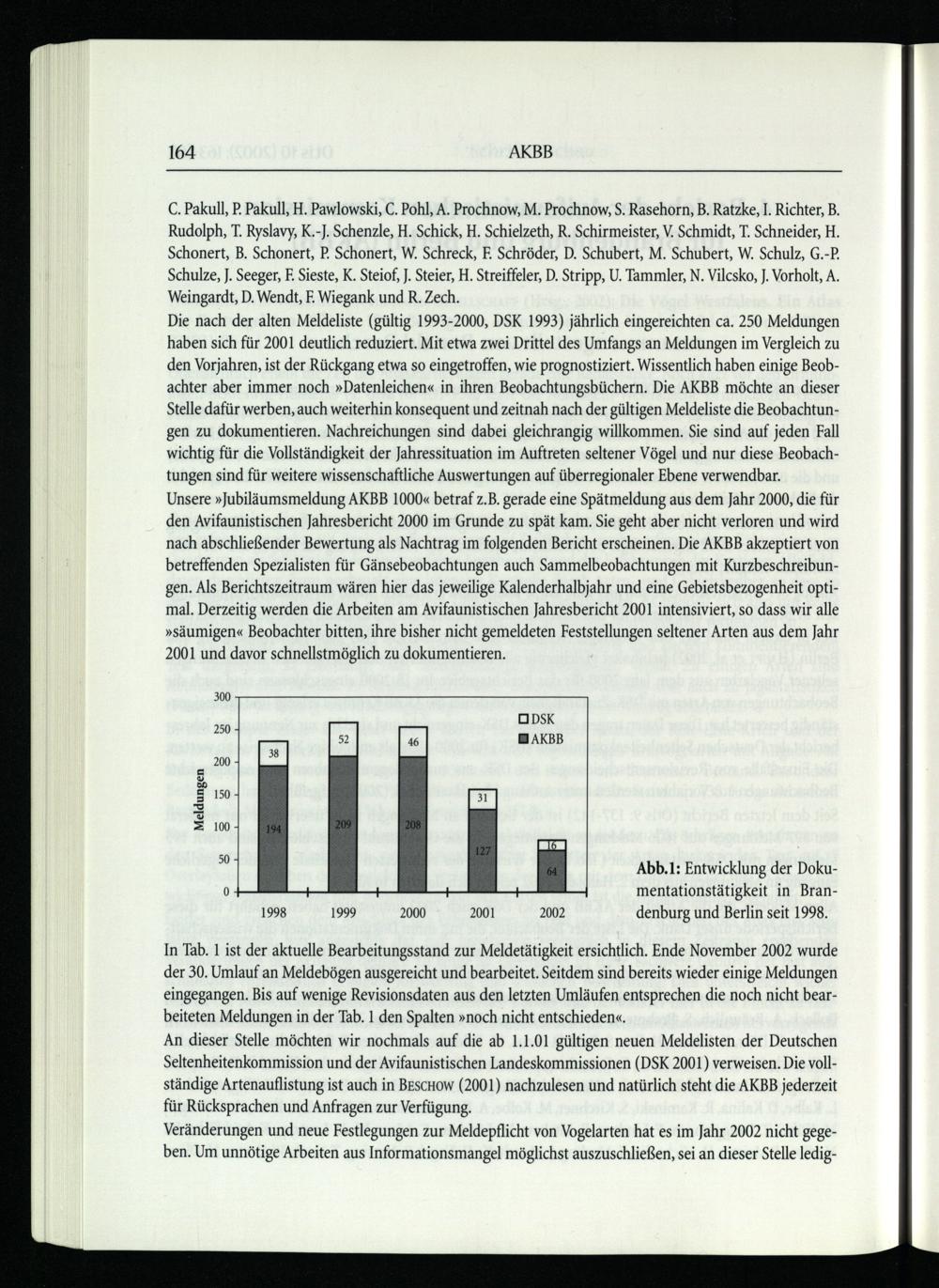 Die nach der alten Meldeliste(gültig 1993-2000, DSK 1993) jährlich eingereichten ca. 250 Meldungen haben sich für 2001 deutlich reduziert. Mit etwa zwei Drittel des Umfangs an Meldungen im Vergleich zu den Vorjahren, ist der Rückgang etwa so eingetroffen, wie prognostiziert. Wissentlich haben einige Beobachter aber immer noch»Datenleichen« in ihren Beobachtungsbüchern. Die AKBB möchte an dieser Stelle dafür werben, auch weiterhin konsequent und zeitnah nach der gültigen Meldeliste die Beobachtungen zu dokumentieren. Nachreichungen sind dabei gleichrangig willkommen. Sie sind auf jeden Fall wichtig für die Vollständigkeit der Jahressituation im Auftreten seltener Vögel und nur diese Beobachtungen sind für weitere wissenschaftliche Auswertungen auf überregionaler Ebene verwendbar.