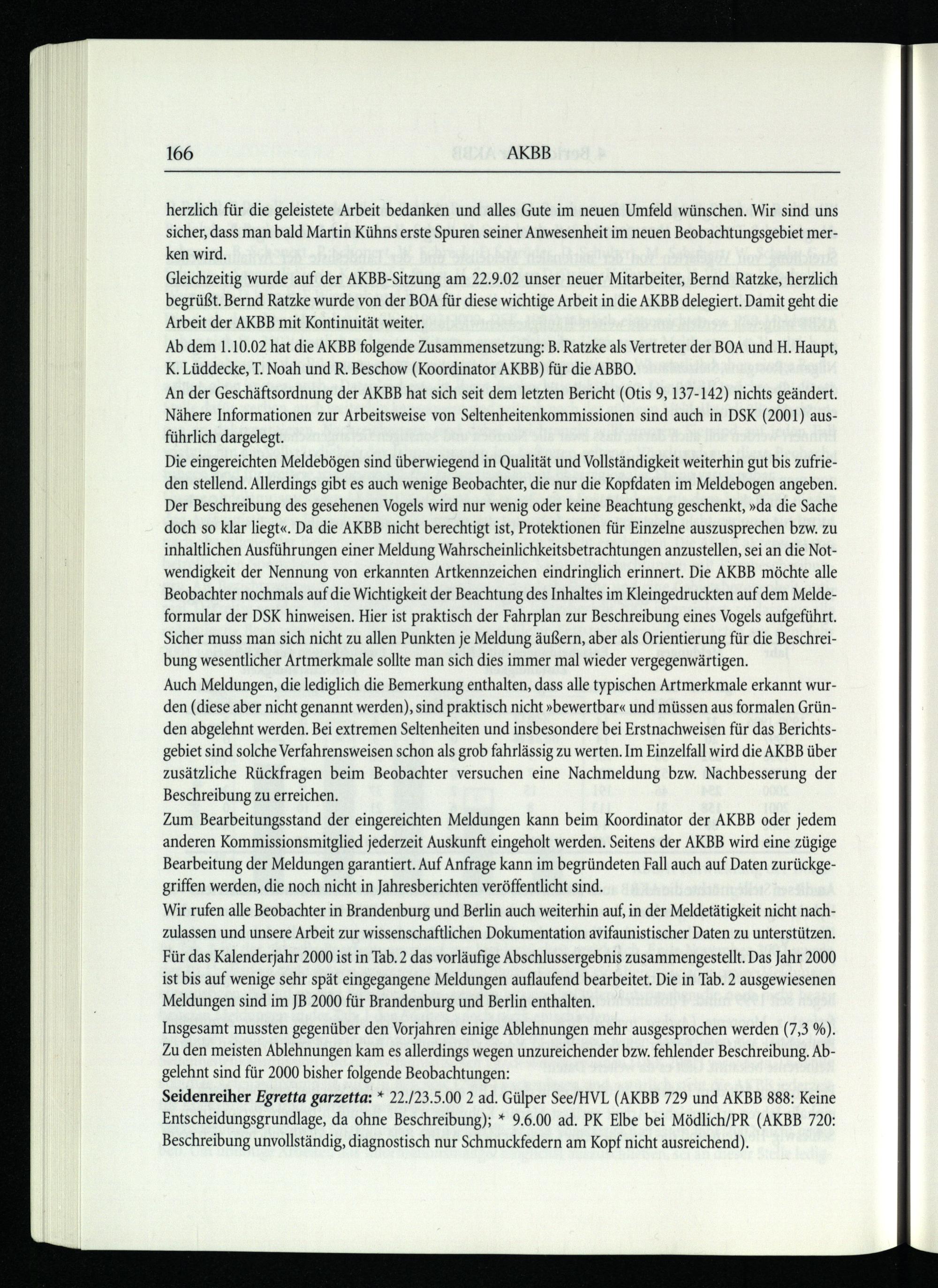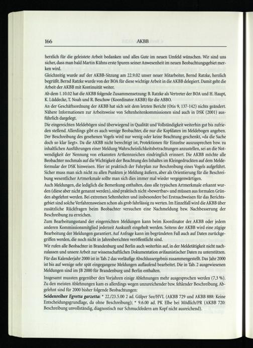 Seidenreiher Egreftta garzetta:* 22./23.5.00 2 ad. Gülper See/HVL (AKBB 729 und AKBB 888: Keine Entscheidungsgrundlage, da ohne Beschreibung);* 9.6.00 ad. PK Elbe bei Mödlich/PR(AKBB 720: Beschreibung unvollständig, diagnostisch nur Schmuckfedern am Kopf nicht ausreichend).