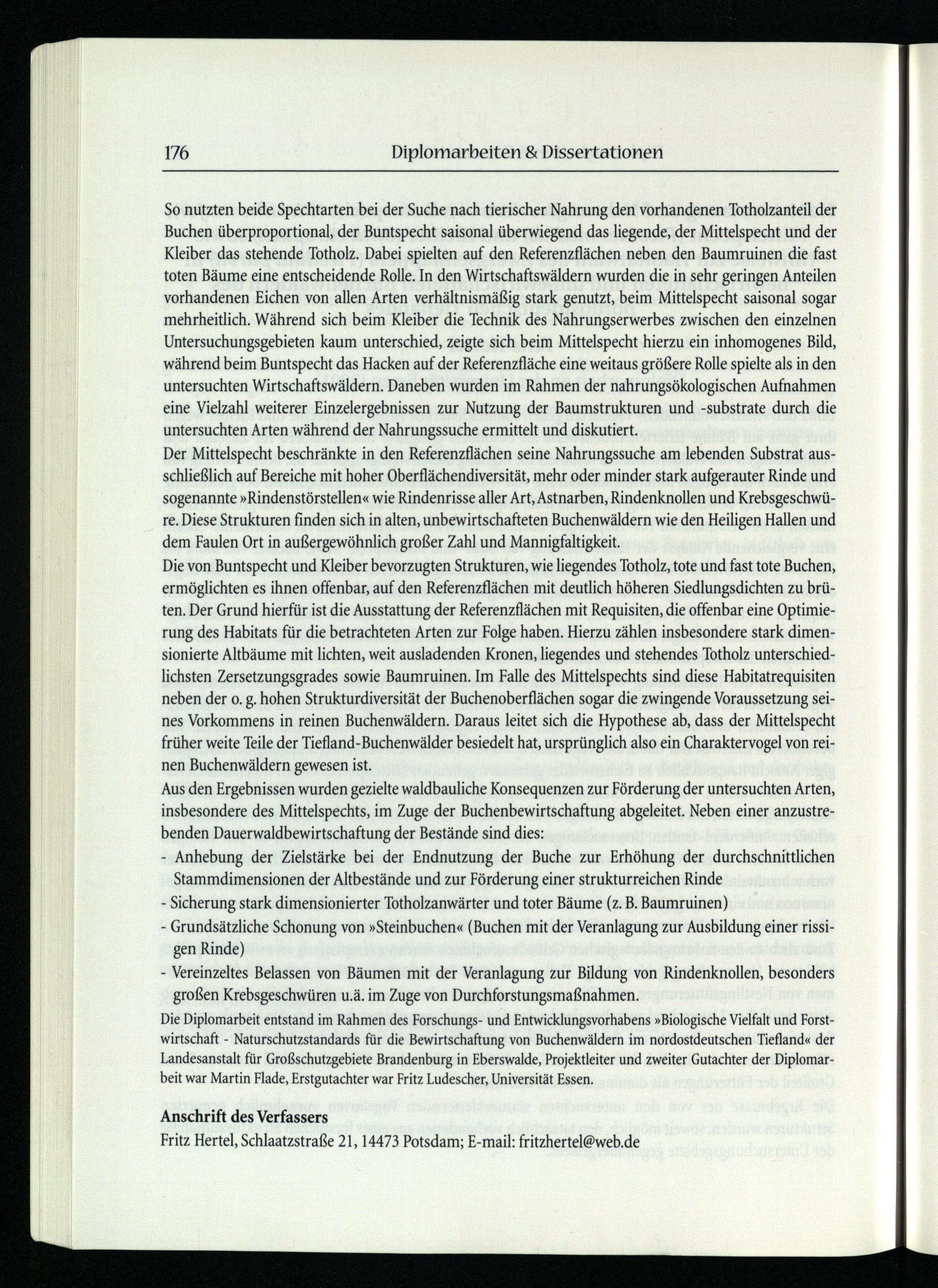 So nutzten beide Spechtarten bei der Suche nach tierischer Nahrung den vorhandenen Totholzanteil der Buchen überproportional, der Buntspecht saisonal überwiegend das liegende, der Mittelspecht und der Kleiber das stehende Totholz. Dabei spielten auf den Referenzflächen neben den Baumruinen die fast toten Bäume eine entscheidende Rolle. In den Wirtschaftswäldern wurden die in sehr geringen Anteilen vorhandenen Eichen von allen Arten verhältnismäßig stark genutzt, beim Mittelspecht saisonal sogar mehrheitlich. Während sich beim Kleiber die Technik des Nahrungserwerbes zwischen den einzelnen Untersuchungsgebieten kaum unterschied, zeigte sich beim Mittelspecht hierzu ein inhomogenes Bild, während beim Buntspecht das Hacken auf der Referenzfläche eine weitaus größere Rolle spielte als in den untersuchten Wirtschaftswäldern. Daneben wurden im Rahmen der nahrungsökologischen Aufnahmen eine Vielzahl weiterer Einzelergebnissen zur Nutzung der Baumstrukturen und-substrate durch die untersuchten Arten während der Nahrungssuche ermittelt und diskutiert. Der Mittelspecht beschränkte in den Referenzflächen seine Nahrungssuche am lebenden Substrat ausschließlich auf Bereiche mit hoher Oberflächendiversität, mehr oder minder stark aufgerauter Rinde und sogenannte»Rindenstörstellen« wie Rindenrisse aller Art, Astnarben, Rindenknollen und Krebsgeschwüre. Diese Strukturen finden sich in alten, unbewirtschafteten Buchenwäldern wie den Heiligen Hallen und dem Faulen Ort in außergewöhnlich großer Zahl und Mannigfaltigkeit. Die von Buntspecht und Kleiber bevorzugten Strukturen, wie liegendes Totholz, tote und fast tote Buchen, ermöglichten es ihnen offenbar, auf den Referenzflächen mit deutlich höheren Siedlungsdichten zu brüten. Der Grund hierfür ist die Ausstattung der Referenzflächen mit Requisiten, die offenbar eine Optimierung des Habitats für die betrachteten Arten zur Folge haben. Hierzu zählen insbesondere stark dimensionierte Altbäume mit lichten, weit ausladenden Kronen, liegendes und stehendes Totholz unterschiedlichsten Zersetzungsgrades sowie Baumruinen. Im Falle des Mittelspechts sind diese Habitatrequisiten neben der o. g. hohen Strukturdiversität der Buchenoberflächen sogar die zwingende Voraussetzung seines Vorkommens in reinen Buchenwäldern. Daraus leitet sich die Hypothese ab, dass der Mittelspecht früher weite Teile der Tiefland-Buchenwälder besiedelt hat, ursprünglich also ein Charaktervogel von reinen Buchenwäldern gewesen ist. Aus den Ergebnissen wurden gezielte waldbauliche Konsequenzen zur Förderung der untersuchten Arten, insbesondere des Mittelspechts, im Zuge der Buchenbewirtschaftung abgeleitet. Neben einer anzustrebenden Dauerwaldbewirtschaftung der Bestände sind dies: - Anhebung der Zielstärke bei der Endnutzung der Buche zur Erhöhung der durchschnittlichen Stammdimensionen der Altbestände und zur Förderung einer strukturreichen Rinde - Sicherung stark dimensionierter Totholzanwärter und toter Bäume(z. B. Baumruinen) - Grundsätzliche Schonung von»Steinbuchen«(Buchen mit der Veranlagung zur Ausbildung einer rissigen Rinde) - Vereinzeltes Belassen von Bäumen mit der Veranlagung zur Bildung von Rindenknollen, besonders großen Krebsgeschwüren u.ä. im Zuge von Durchforstungsmaßnahmen. Die Diplomarbeit entstand im Rahmen des Forschungs- und Entwicklungsvorhabens»Biologische Vielfalt und Forstwirtschaft- Naturschutzstandards für die Bewirtschaftung von Buchenwäldern im nordostdeutschen Tiefland« der Landesanstalt für Großschutzgebiete Brandenburg in Eberswalde , Projektleiter und zweiter Gutachter der Diplomarbeit war Martin Flade , Erstgutachter war Fritz Ludescher, Universität Essen.