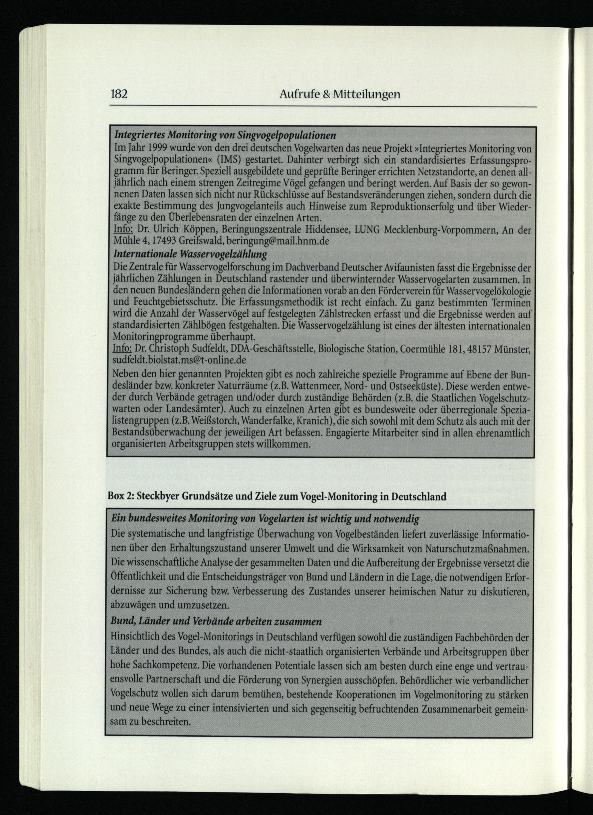 Im Jahr 1999 wurde von den drei deutschen Vogelwarten das neue Projekt»Integriertes Monitoring von Singvogelpopulationen«(IMS) gestartet. Dahinter verbirgt sich ein standardisiertes Erfassungsprogramm für Beringer. Speziell ausgebildete und geprüfte Beringer errichten Netzstandorte, an denen allJährlich nach einem strengen Zeitregime Vögel gefangen und beringt werden. Auf Basis der so gewonnenen Daten lassen sich nicht nur Rückschlüsse auf Bestandsveränderungen ziehen, sondern durch die exakte Bestimmung des Jungvogelanteils auch Hinweise zum Reproduktionserfolg und über Wiederfänge zu den Überlebensraten der einzelnen Arten.