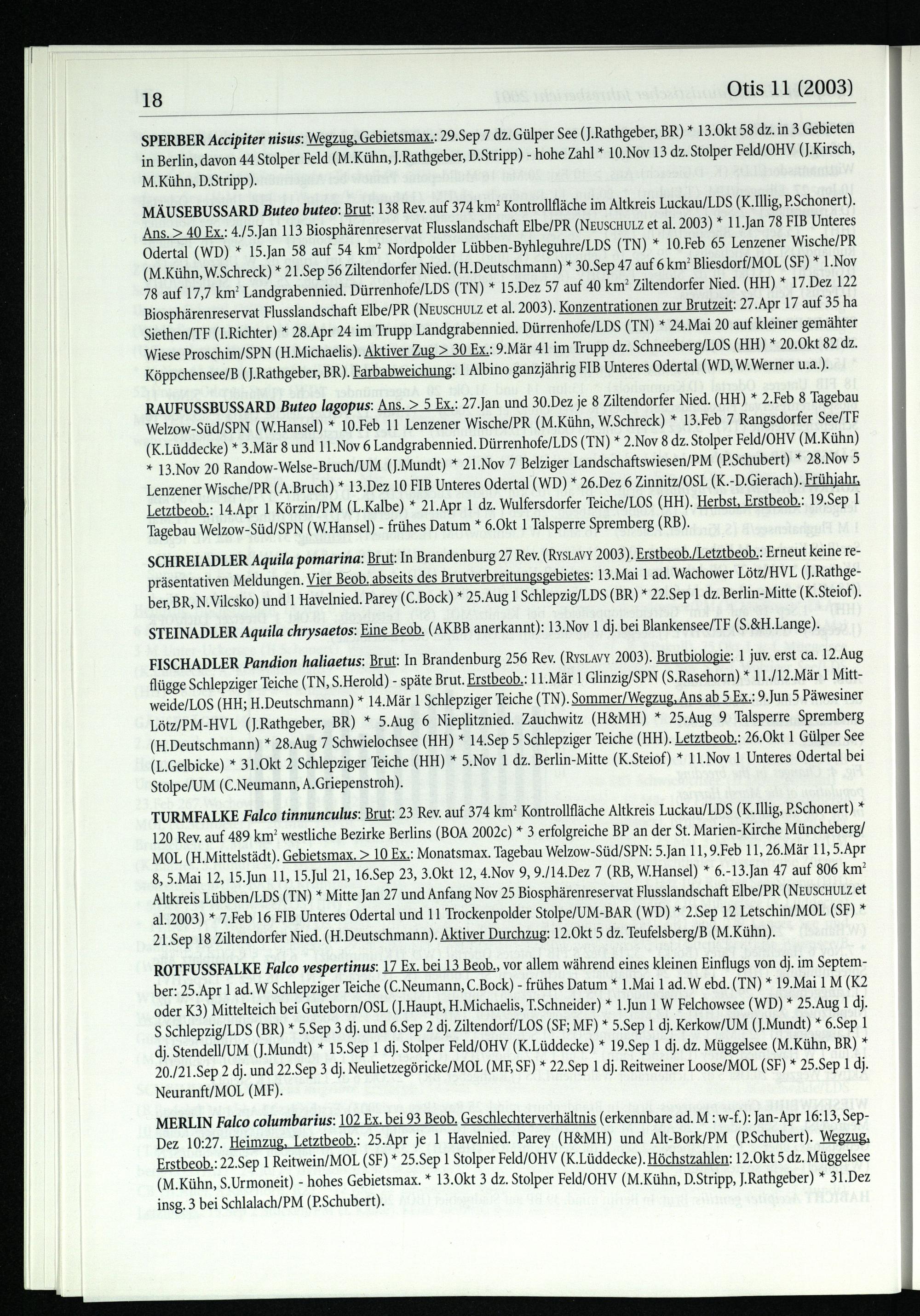 TURMFALKE Falco tinnunculus : Brut: 23 Rev. auf 374 km? Kontrollfläche Altkreis Luckau/LDS (K.Illig, P.Schonert)* 120 Rev. auf 489 km? westliche Bezirke Berlins (BOA 2002c)* 3 erfolgreiche BP an der St. Marien-Kirche Müncheberg / MOL(H.Mittelstädt). Gebietsmax.> 10 Ex.: Monatsmax. Tagebau Welzow-Süd/SPN : 5.Jan 11, 9.Feb 11, 26.Mär 11, 5.Apr 8, 5.Mai 12, 15.Jun 11, 15.Jul 21, 16.Sep 23, 3.Okt 12, 4.Nov 9, 9./14.Dez 7(RB, W.Hansel)* 6.-13.Jan 47 auf 806 km” Altkreis Lübben/LDS (TN)* Mitte Jan 27 und Anfang Nov 25 Biosphärenreservat Flusslandschaft Elbe/PR(NEUSCHULZ et al. 2003)* 7.Feb 16 FIB Unteres Odertal und 11 Trockenpolder Stolpe/UM-BAR(WD)* 2.Sep 12 Letschin/MOL (SF)* 21.Sep 18 Ziltendorfer Nied. (H.Deutschmann). Aktiver Durchzug: 12.Okt 5 dz. Teufelsberg/B(M.Kühn).