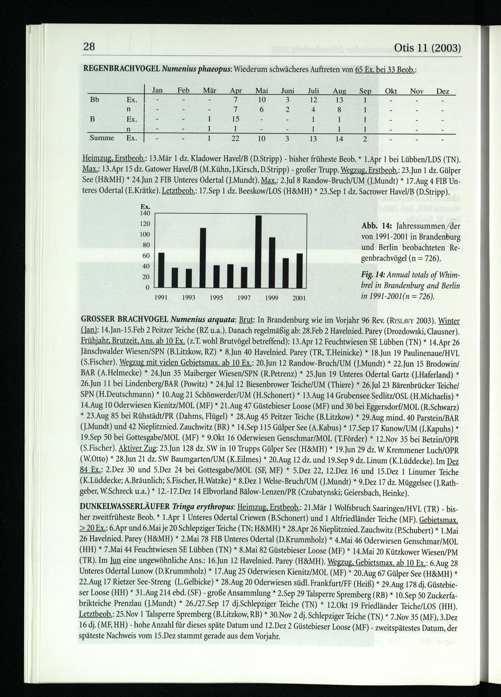 GROSSER BRACHVOGEL Numenius arquata : Brut: In Brandenburg wie im Vorjahr 96 Rev.(RysLAvy 2003). Winter (Jan): 14.Jan-15.Feb 2 Peitzer Teiche(RZ u.a.). Danach regelmäßig ab: 28.Feb 2 Havelnied. Parey (Drozdowski, Clausner). Frühjahr, Brutzeit, Ans. ab 10 Ex.(z.T. wohl Brutvögel betreffend): 13.Apr 12 Feuchtwiesen SE Lübben(TN)* 14.Apr 26 Jänschwalder Wiesen/SPN (B.Litzkow, RZ)* 8.Jun 40 Havelnied. Parey (TR, T.Heinicke)* 18.Jun 19 Paulinenaue/HVL (S.Fischer ). Wegzug mit vielen Gebietsmax. ab 10 Ex.: 20.Jun 12 Randow-Bruch/UM(J.Mundt)* 22.Jun 15 Brodowin / BAR(A.Helmecke)* 24.Jun 35 Maiberger Wiesen/SPN (R.Petrenz)* 25.Jun 19 Unteres Odertal Gartz(J.Haferland)* 26.Jun 11 bei Lindenberg/BAR(Powitz)* 24.Jul 12 Biesenbrower Teiche/UM(Thiere)* 26.Jul 23 Bärenbrücker Teiche/ SPN (H.Deutschmann)* 10.Aug 21 Schönwerder/UM(H.Schonert)* 13.Aug 14 Grubensee Sedlitz/OSL (H.Michaelis)* 14.Aug 10 Oderwiesen Kienitz/MOL (MF)* 21.Aug 47 Güstebieser Loose(MF) und 30 bei Eggersdorf/MOL (R.Schwarz) * 23.Aug 85 bei Rühstädt/PR (Dahms, Flügel)* 28.Aug 45 Peitzer Teiche(B.Litzkow)* 29.Aug mind. 40 Parstein/BAR (J.Mundt) und 42 Nieplitznied. Zauchwitz (BR )* 14.Sep 115 Gülper See(A.Kabus)* 17.Sep 17 Kunow/UM(I.Kapuhs)* 19.Sep 50 bei Gottesgabe/MOL(MF)* 9.Okt 16 Oderwiesen Genschmar/MOL(T.Förder)* 12.Nov 35 bei Betzin/OPR (S.Fischer ). Aktiver Zug: 23.Jun 128 dz. SW in 10 Trupps Gülper See(H&MH)* 19.Jun 29 dz. W Kremmener Luch/OPR (W.Otto)* 28.Jun 21 dz. SW Baumgarten/UM(K.Eilmes)* 20.Aug 12 dz. und 19.Sep 9 dz. Linum (K.Lüddecke). Im Dez 84 Ex.: 2.Dez 30 und 5.Dez 24 bei Gottesgabe/MOL(SE MF)* 5.Dez 22, 12.Dez 16 und 15.Dez 1 Linumer Teiche (K.Lüddecke; A.Bräunlich; S.Fischer , H.Watzke)* 8.Dez 1 Welse-Bruch/UM(J.Mundt)* 9.Dez 17 dz. Müggelsee(J.Rathgeber, W.Schreck u.a.)* 12.-17.Dez 14 Elbvorland Bälow-Lenzen/PR(Czubatynski; Geiersbach, Heinke).