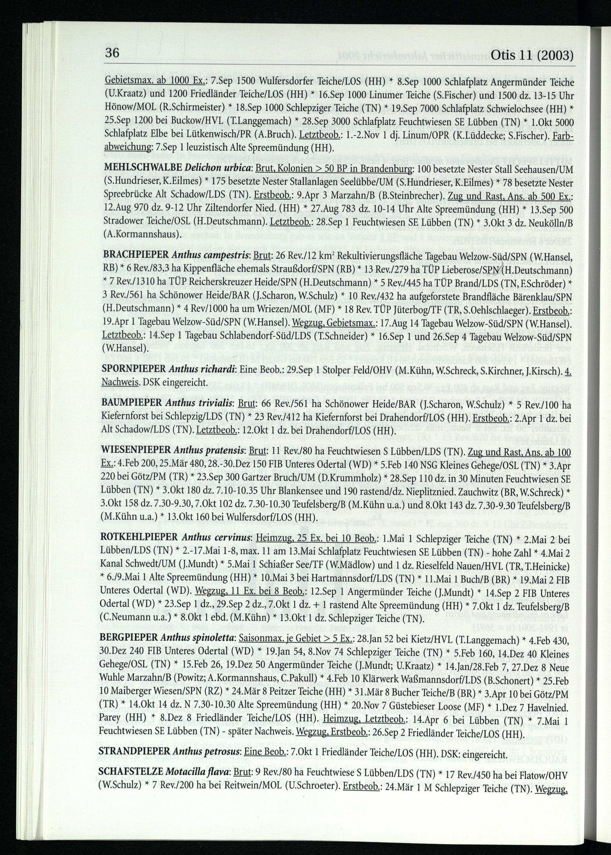 WIESENPIEPER Anthus pratensis: Brut: 11 Rev./80 ha Feuchtwiesen S Lübben/LDS (TN). Zug und Rast, Ans. ab 100 Ex.: 4.Feb 200, 25.Mär 480, 28.-30.Dez 150 FIB Unteres Odertal(WD)* 5.Feb 140 NSG Kleines Gehege/OSL (TN)* 3.Apr 220 bei Götz/PM(TR)* 23.Sep 300 Gartzer Bruch/UM(D.Krummholz)* 28.Sep 110 dz. in 30 Minuten Feuchtwiesen SE Lübben(TN)* 3.Okt 180 dz. 7.10-10.35 Uhr Blankensee und 190 rastend/dz. Nieplitznied. Zauchwitz (BR , W.Schreck)* 3.Okt 158 dz. 7.30-9.30, 7.Okt 102 dz. 7.30-10.30 Teufelsberg/B(M.Kühn u.a.) und 8.Okt 143 dz. 7.30-9.30 Teufelsberg/B (M.Kühn u.a.)* 13.Okt 160 bei Wulfersdorf/LOS (HH ).
