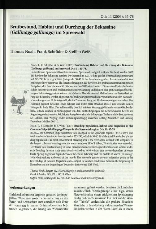 Thomas Noah, Bergstr. 14, 15910 Schlepzig , e-mail: tomnoah@t-online.de Frank Schröder, PF 1322, 15903 Lübben Steffen Weiß, Siedlungsstr. 4a, 15913 Alt Zauche, e-mail: weiss.st@gmx.de