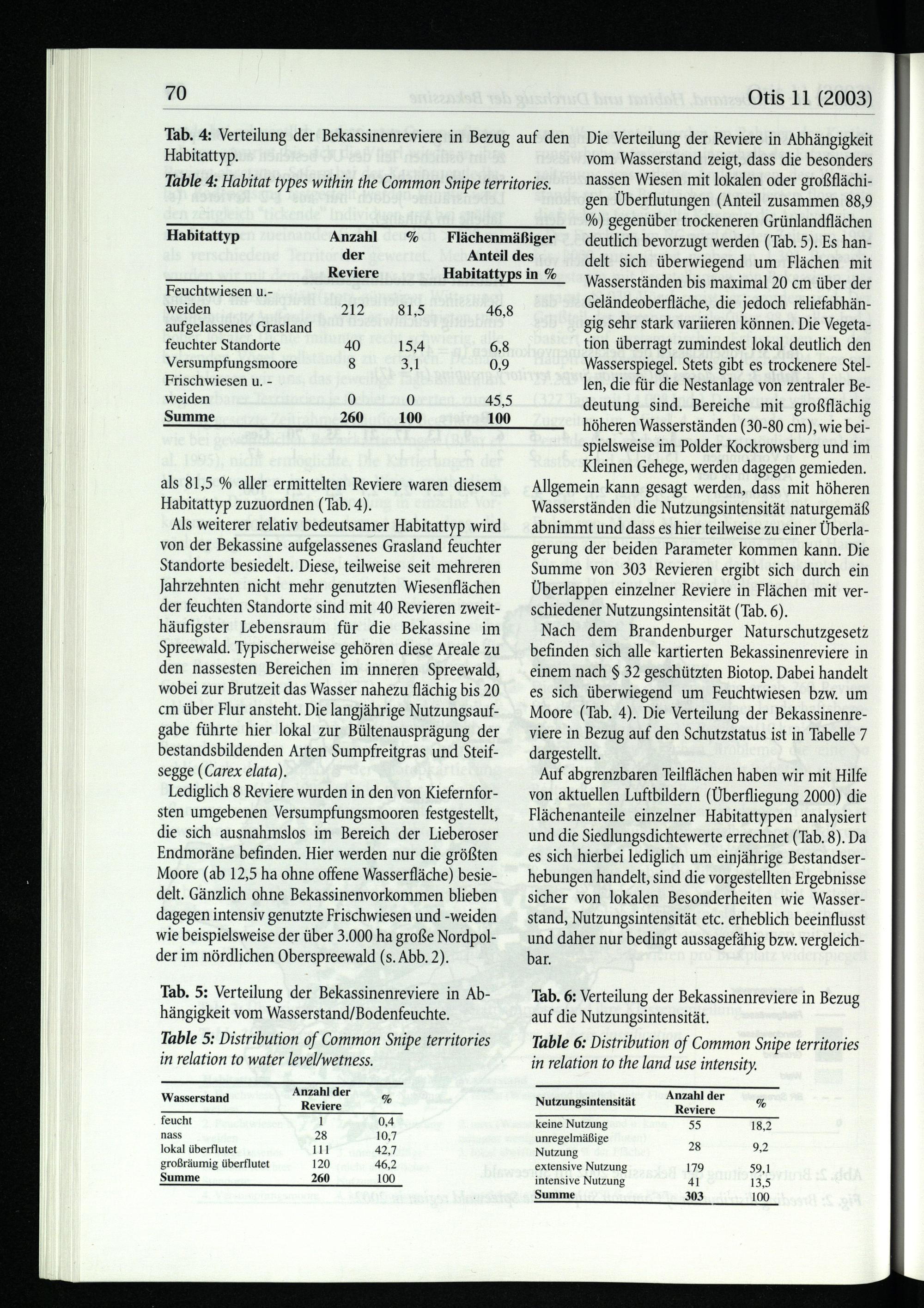 Die Verteilung der Reviere in Abhängigkeit vom Wasserstand zeigt, dass die besonders nassen Wiesen mit lokalen oder großflächigen Überflutungen(Anteil zusammen 88,9 %) gegenüber trockeneren Grünlandflächen deutlich bevorzugt werden(Tab. 5). Es handelt sich überwiegend um Flächen mit Wasserständen bis maximal 20 cm über der Geländeoberfläche, die jedoch reliefabhängig sehr stark variieren können. Die Vegetation überragt zumindest lokal deutlich den Wasserspiegel. Stets gibt es trockenere Stellen, die für die Nestanlage von zentraler Bedeutung sind. Bereiche mit großflächig höheren Wasserständen(30-80 cm), wie beispielsweise im Polder Kockrowsberg und im Kleinen Gehege, werden dagegen gemieden. Allgemein kann gesagt werden, dass mit höheren Wasserständen die Nutzungsintensität naturgemäß abnimmt und dass es hier teilweise zu einer Überlagerung der beiden Parameter kommen kann. Die Summe von 303 Revieren ergibt sich durch ein Überlappen einzelner Reviere in Flächen mit verschiedener Nutzungsintensität(Tab. 6).