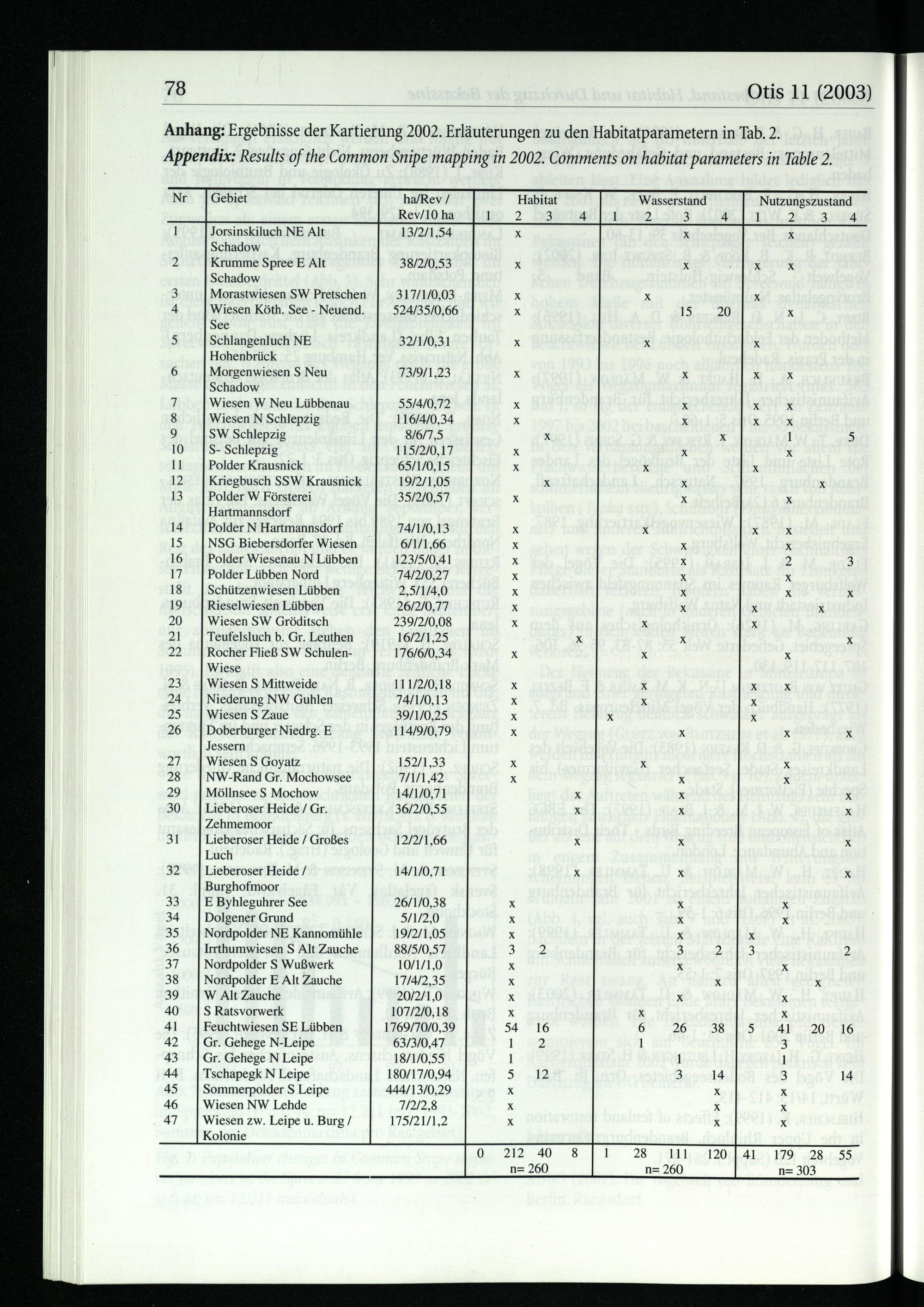 Anhang: Ergebnisse der Kartierung 2002. Erläuterungen zu den Habitatparametern in Tab. 2. Appendix: Results of the Common Snipe mapping in 2002. Comments on habitat parameters in Table 2.