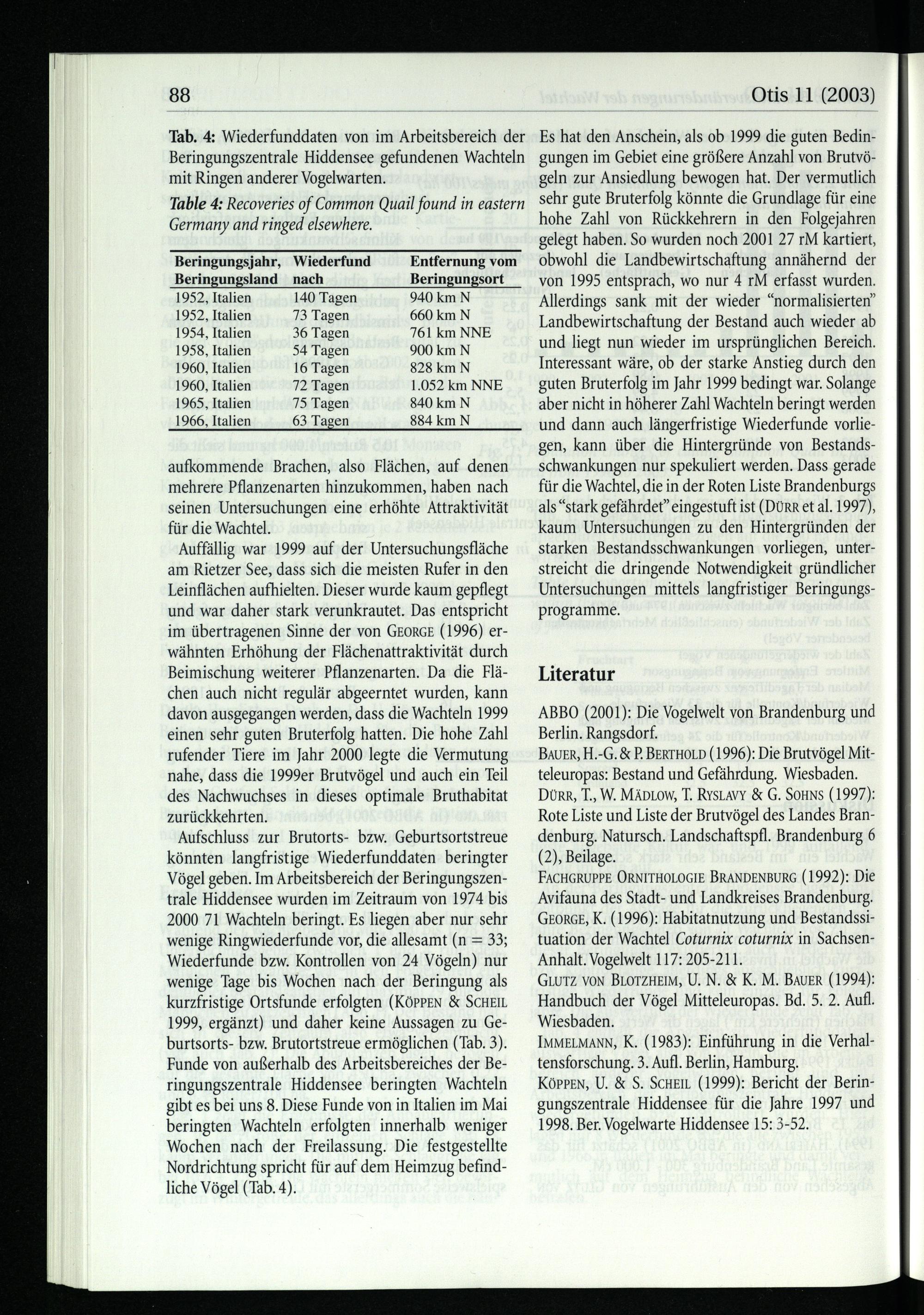 FACHGRUPPE ORNITHOLOGIE BRANDENBURG(1992): Die Avifauna des Stadt- und Landkreises Brandenburg . GEORGE, K.(1996): Habitatnutzung und Bestandssituation der Wachtel Coturnix coturnix in SachsenAnhalt. Vogelwelt 117: 205-211.