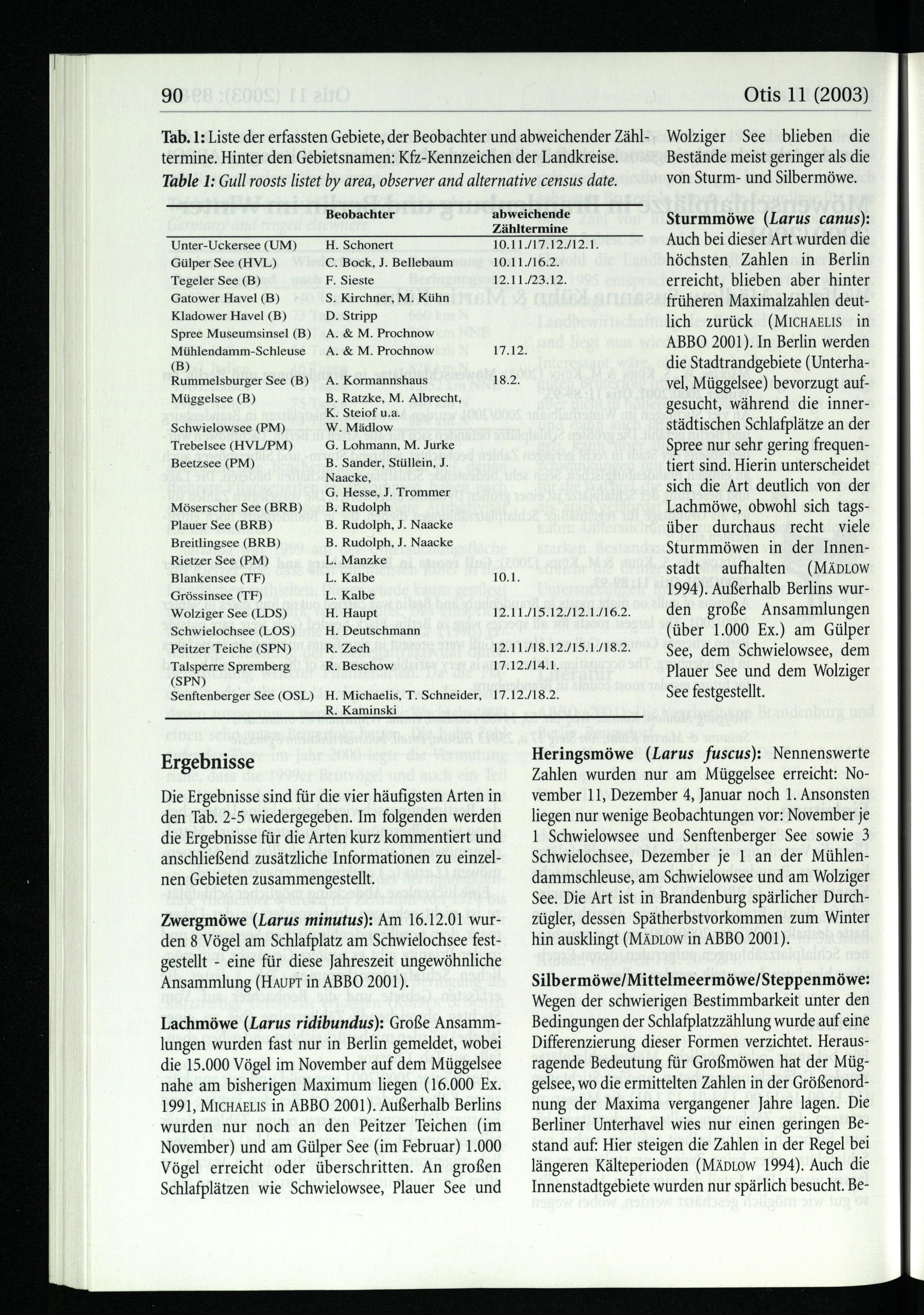 termine. Hinter den Gebietsnamen: Kfz-Kennzeichen der Landkreise. Table 1: Gull roosts listet by area, observer and alternative census date.