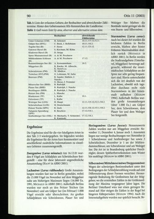 Lachmöwe(Larus ridibundus ): Große Ansamm­lungen wurden fast nur in Berlin gemeldet, wobei die 15.000 Vögel im November auf dem Müggelsee nahe am bisherigen Maximum liegen(16.000 Ex. 1991, MICHAELIS in ABBO 2001). Außerhalb Berlins wurden nur noch an den Peitzer Teichen(im November) und am Gülper See(im Februar) 1.000 Vögel erreicht oder überschritten. An großen Schlafplätzen wie Schwielowsee , Plauer See und