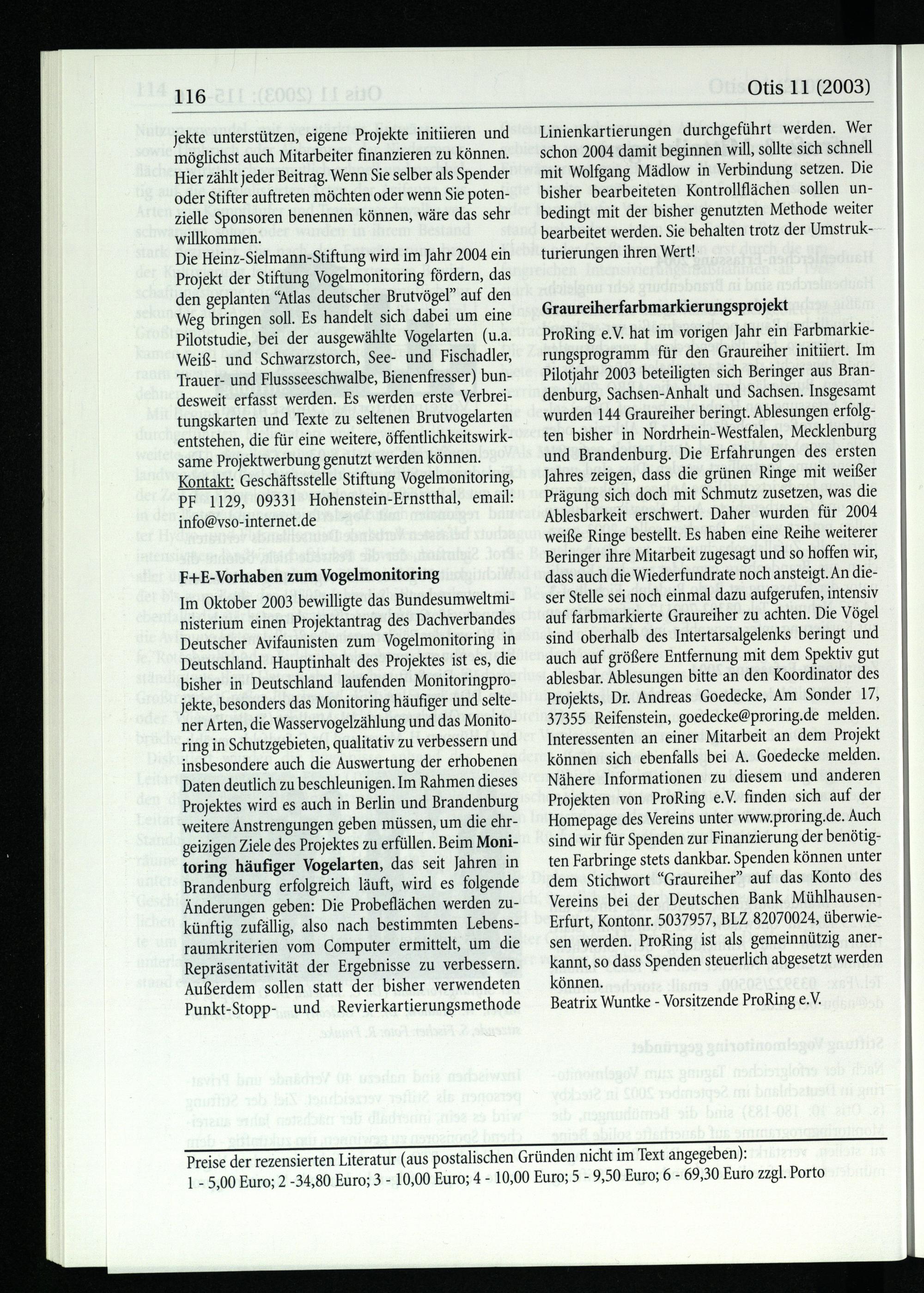 Die Heinz-Sielmann-Stiftung wird im Jahr 2004 ein Projekt der Stiftung Vogelmonitoring fördern, das den geplanten“Atlas deutscher Brutvögel” auf den Weg bringen soll. Es handelt sich dabei um eine Pilotstudie, bei der ausgewählte Vogelarten(u.a. Weiß- und Schwarzstorch, See- und Fischadler, Trauer- und Flussseeschwalbe, Bienenfresser) bundesweit erfasst werden. Es werden erste Verbreitungskarten und Texte zu seltenen Brutvogelarten entstehen, die für eine weitere, öffentlichkeitswirksame Projektwerbung genutzt werden können. Kontakt: Geschäftsstelle Stiftung Vogelmonitoring, PF 1129, 09331 Hohenstein-Ernstthal , email: info@vso-internet.de