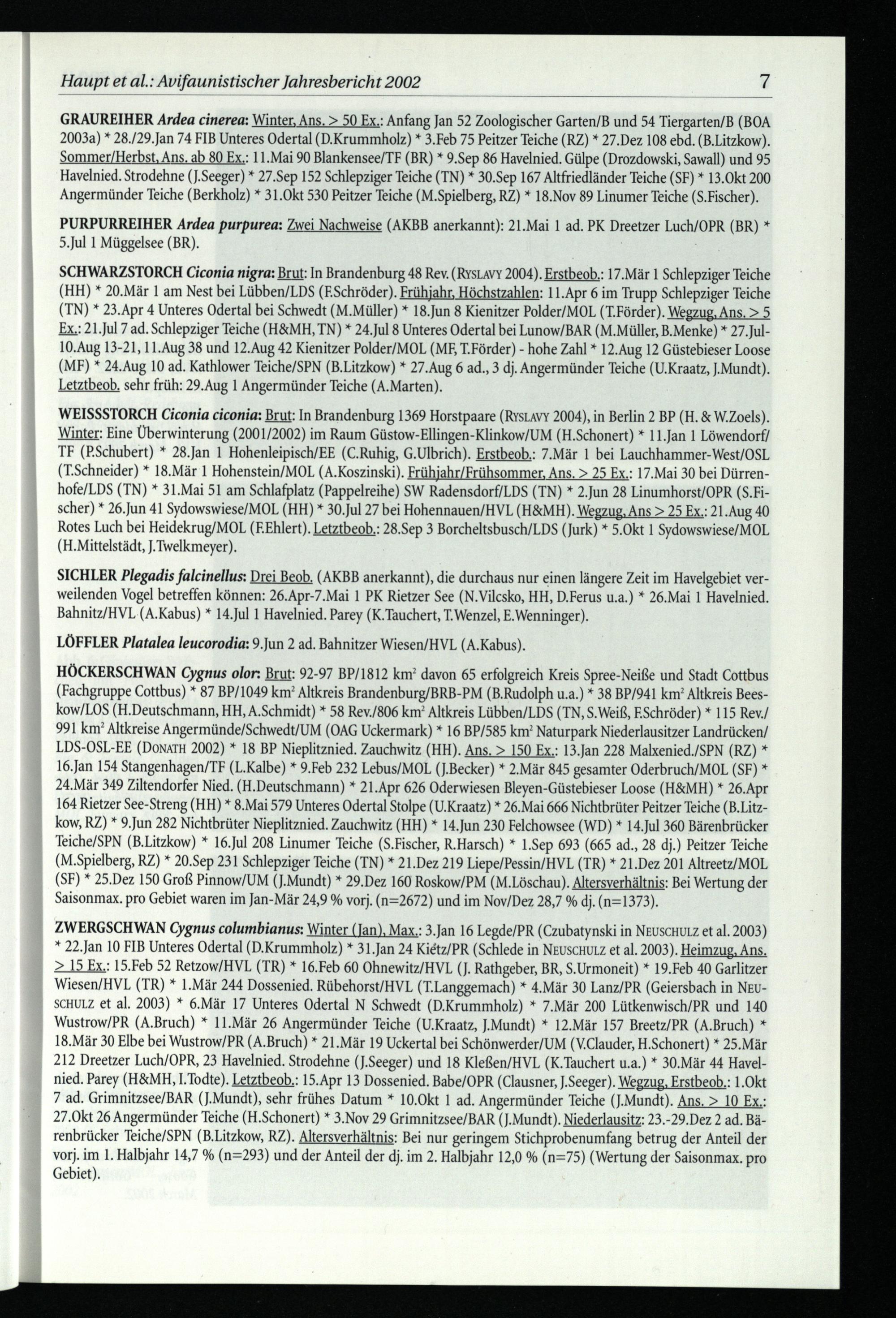 WEISSSTORCH Ciconia ciconia: Brut: In Brandenburg 1369 Horstpaare(RysLAvY 2004), in Berlin 2 BP(H.& W.Zoels). Winter: Eine Überwinterung(2001/2002) im Raum Güstow-Ellingen-Klinkow/UM(H.Schonert)* 11.Jan 1 Löwendorf/ TF(P.:Schubert)* 28.Jan 1 Hohenleipisch/EE(C.Ruhig, G.Ulbrich). Erstbeob.: 7.Mär 1 bei Lauchhammer-West/OSL (T.Schneider)* 18.Mär 1 Hohenstein/MOL(A.Koszinski). Frühjahr/Frühsommer, Ans.> 25 Ex.: 17.Mai 30 bei Dürrenhofe/LDS (TN)* 31.Mai 51 am Schlafplatz(Pappelreihe) SW Radensdorf/LDS (TN)* 2.Jun 28 Linumhorst/OPR (S.Fi scher )* 26.Jun 41 Sydowswiese/MOL(HH)* 30.Jul 27 bei Hohennauen/HVL (H&MH). Wegzug, Ans> 25 Ex.: 21.Aug 40 Rotes Luch bei Heidekrug/MOL(EEhlert). Letztbeob.: 28.Sep 3 Borcheltsbusch/LDS (Jurk)* 5.Okt 1 Sydowswiese/MOL (H.Mittelstädt, J.Twelkmeyer).