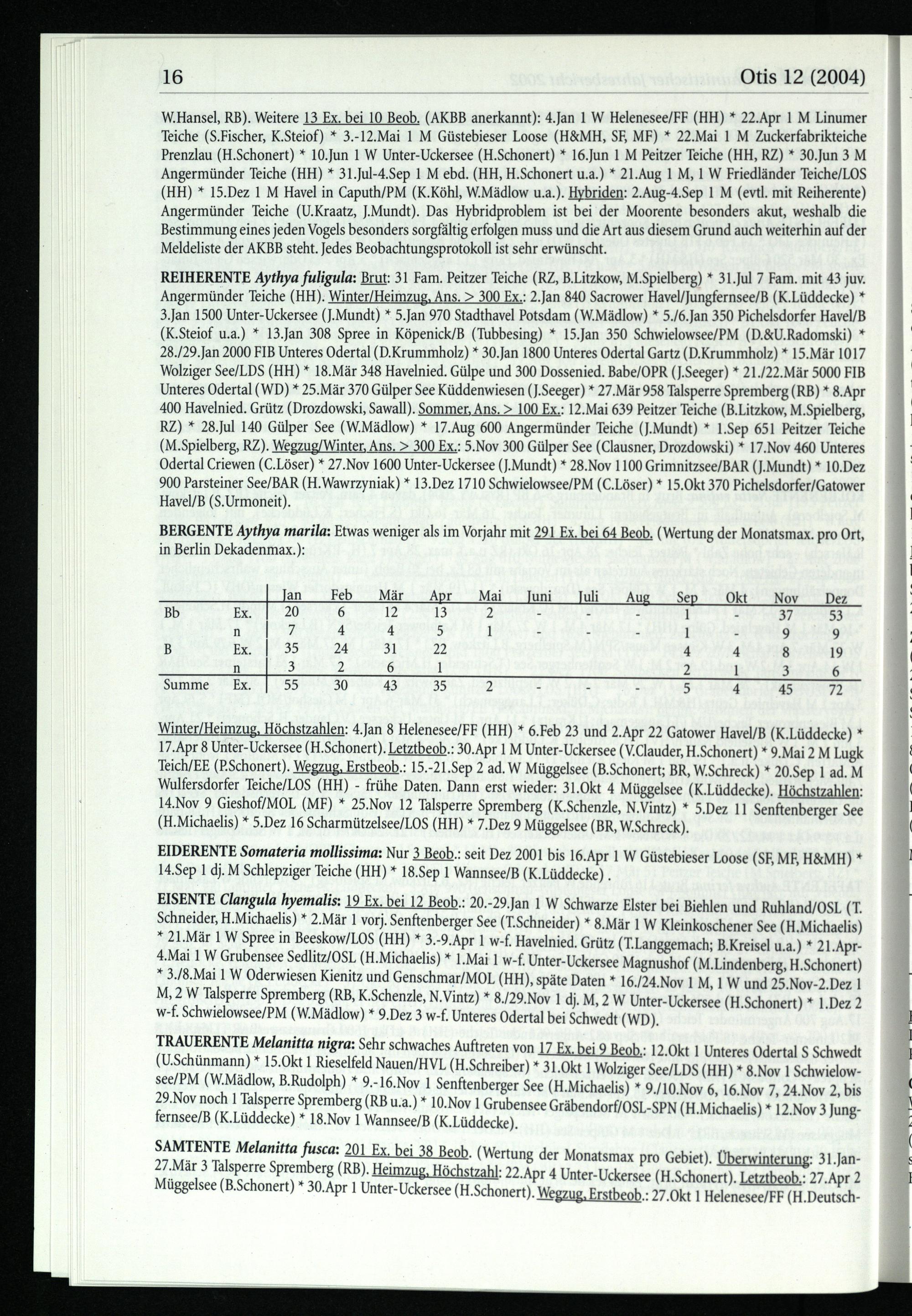 W.Hansel, RB). Weitere 13 Ex. bei 10 Beob.(AKBB anerkannt): 4.Jan 1 W Helenesee/FF(HH )* 22.Apr 1 M Linumer Teiche(S.Fischer , K.Steiof)* 3.-12.Mai 1 M Güstebieser Loose(H&MH, SE, MF)* 22.Mai 1 M Zuckerfabrikteiche Prenzlau(H.Schonert)* 10.Jun 1 W Unter-Uckersee(H.Schonert)* 16.Jun 1 M Peitzer Teiche(HH , RZ)* 30.Jun 3 M Angermünder Teiche(HH)* 31.Jul-4.Sep 1 M ebd.(HH , H.Schonert u.a.)* 21.Aug 1 M, 1 W Friedländer Teiche/LOS (HH)* 15.Dez 1 M Havel in Caputh/PM (K.Köhl, W.Mädlow u.a.). Hybriden: 2.Aug-4.Sep 1 M(evtl. mit Reiherente) Angermünder Teiche(U.Kraatz, J,Mundt). Das Hybridproblem ist bei der Moorente besonders akut, weshalb die Bestimmung eines jeden Vogels besonders sorgfältig erfolgen muss und die Art aus diesem Grund auch weiterhin auf der Meldeliste der AKBB steht. Jedes Beobachtungsprotokoll ist sehr erwünscht.