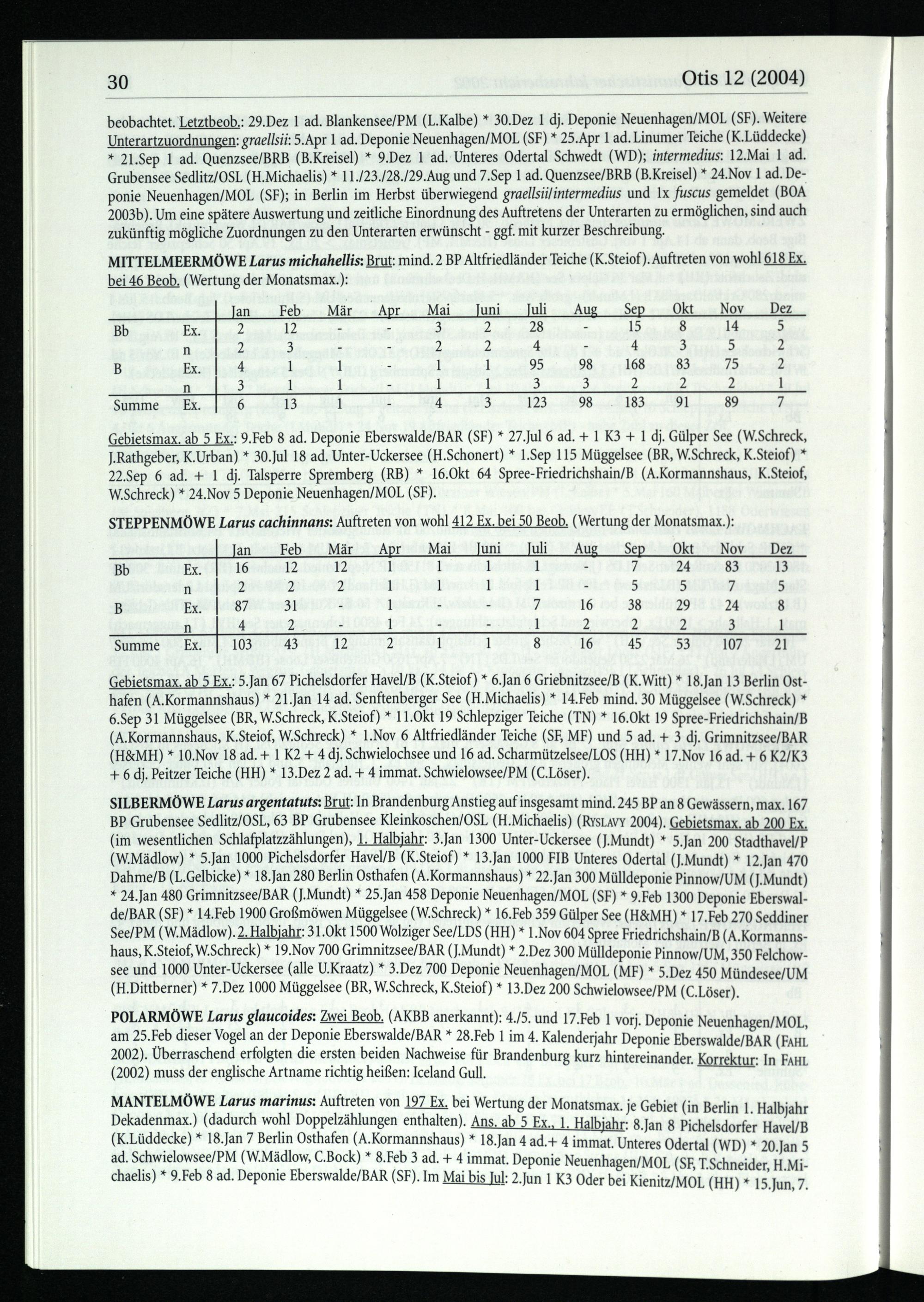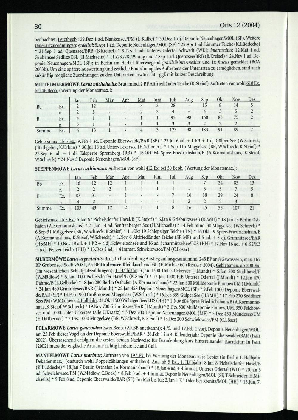 beobachtet. Letztbeob.: 29.Dez 1 ad. Blankensee/PM (L.Kalbe)* 30.Dez 1 dj. Deponie Neuenhagen/MOL (SF). Weitere Unterartzuordnungen: graellsii: 5.Apr 1 ad. Deponie Neuenhagen/MOL (SF)* 25.Apr 1 ad. Linumer Teiche(K.Lüddecke) * 21.Sep 1 ad. Quenzsee/BRB (B.Kreisel)* 9.Dez 1 ad. Unteres Odertal Schwedt (WD); intermedius: 12.Mai 1 ad. Grubensee Sedlitz/OSL (H.Michaelis)* 11./23./28./29.Aug und 7.Sep 1 ad. Quenzsee/BRB (B.Kreisel)* 24.Nov 1 ad. De­ponie Neuenhagen/MOL (SF); in Berlin im Herbst überwiegend graellsii/intermedius und 1x fuscus gemeldet(BOA 2003b). Um eine spätere Auswertung und zeitliche Einordnung des Auftretens der Unterarten zu ermöglichen, sind auch zukünftig mögliche Zuordnungen zu den Unterarten erwünscht- ggf. mit kurzer Beschreibung.