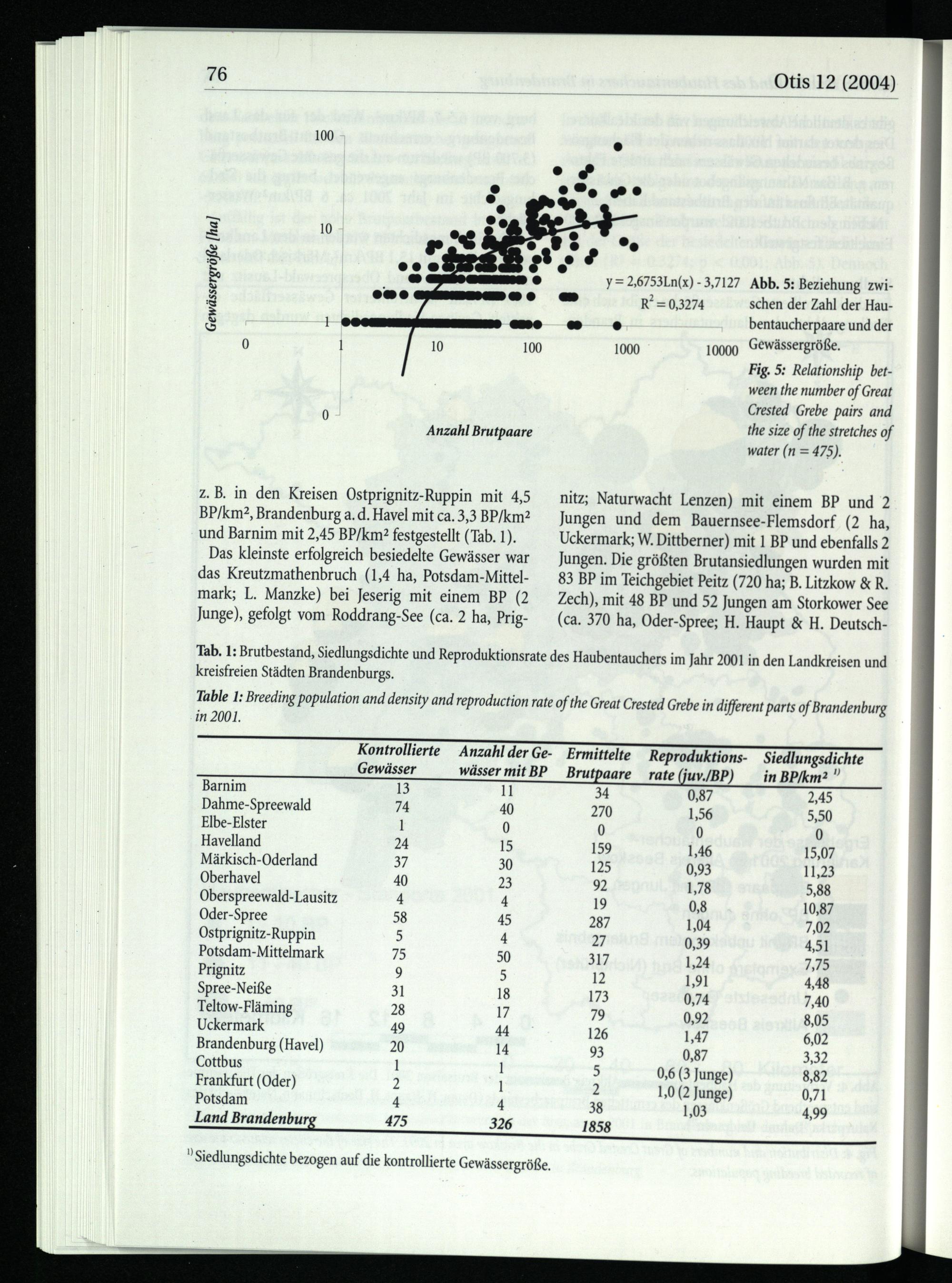 Table 1: Breeding population and density and reproduction rate of the Great Crested Grebe in different parts of Brandenburg