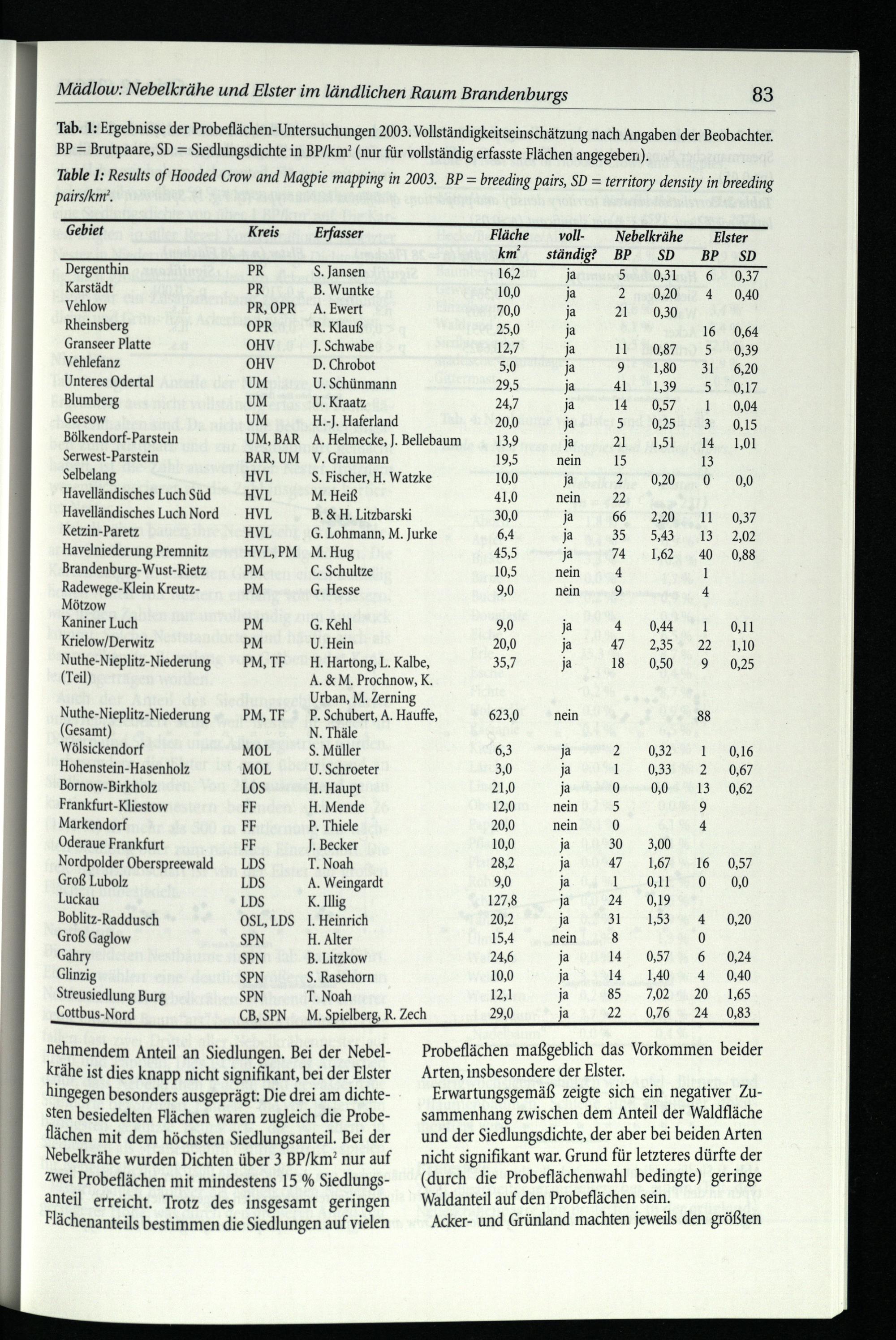 Table 1: Results of Hooded Crow and Magpie mapping in 2003. BP= breeding pairs, SD= territory density in breeding