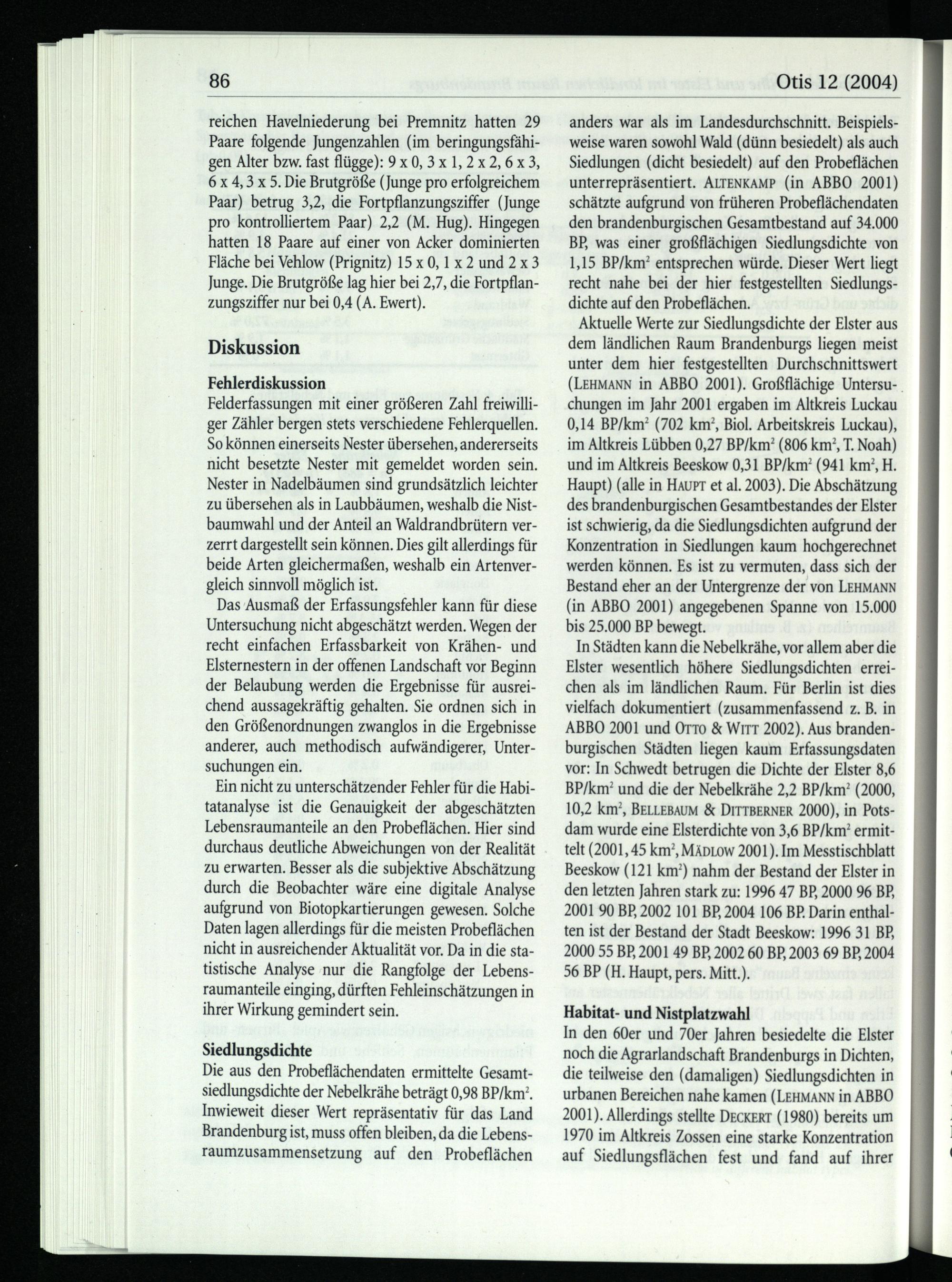 anders war als im Landesdurchschnitt. Beispielsweise waren sowohl Wald(dünn besiedelt) als auch Siedlungen(dicht besiedelt) auf den Probeflächen unterrepräsentiert. ALTENKAMP(in ABBO 2001) schätzte aufgrund von früheren Probeflächendaten den brandenburgischen Gesamtbestand auf 34.000 BP, was einer großflächigen Siedlungsdichte von 1,15 BP/km? entsprechen würde. Dieser Wert liegt recht nahe bei der hier festgestellten Siedlungsdichte auf den Probeflächen.