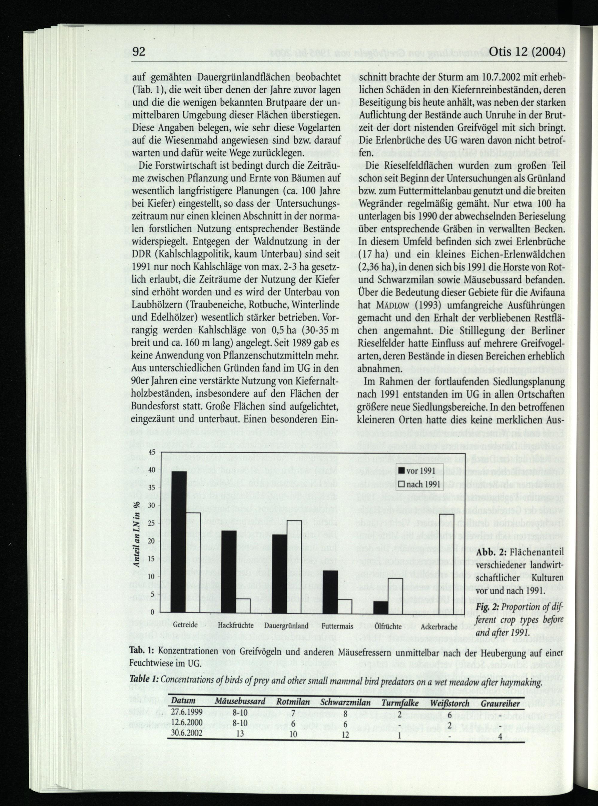 Die Rieselfeldflächen wurden zum großen Teil schon seit Beginn der Untersuchungen als Grünland bzw. zum Futtermittelanbau genutzt und die breiten Wegränder regelmäßig gemäht. Nur etwa 100 ha unterlagen bis 1990 der abwechselnden Berieselung über entsprechende Gräben in verwallten Becken. In diesem Umfeld befinden sich zwei Erlenbrüche (17 ha) und ein kleines Eichen-Erlenwäldchen (2,36 ha), in denen sich bis 1991 die Horste von Rotund Schwarzmilan sowie Mäusebussard befanden. Über die Bedeutung dieser Gebiete für die Avifauna hat MäDLow(1993) umfangreiche Ausführungen gemacht und den Erhalt der verbliebenen Restflächen angemahnt. Die Stilllegung der Berliner Rieselfelder hatte Einfluss auf mehrere Greifvogelarten, deren Bestände in diesen Bereichen erheblich abnahmen.