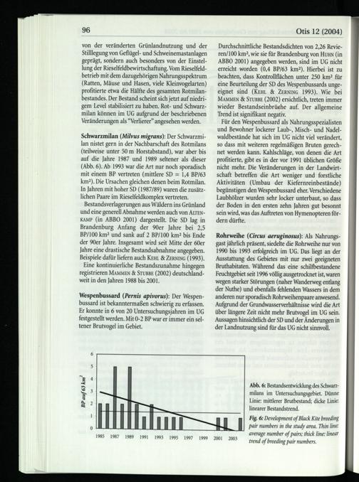 Durchschnittliche Bestandsdichten von 2,26 Revieren/100 km?, wie sie für Brandenburg von HUHN(in ABBO 2001) angegeben werden, sind im UG nicht erreicht worden(0,4 BP/63 km2). Hierbei ist zu beachten, dass Kontrollflächen unter 250 km? für eine Beurteilung der SD des Wespenbussards ungeeignet sind(KEHL& ZERNING 1993). Wie bei MAMMEN& STuBBE(2002) ersichtlich, treten immer wieder Bestandseinbrüche auf. Der allgemeine Trend ist signifikant negativ.