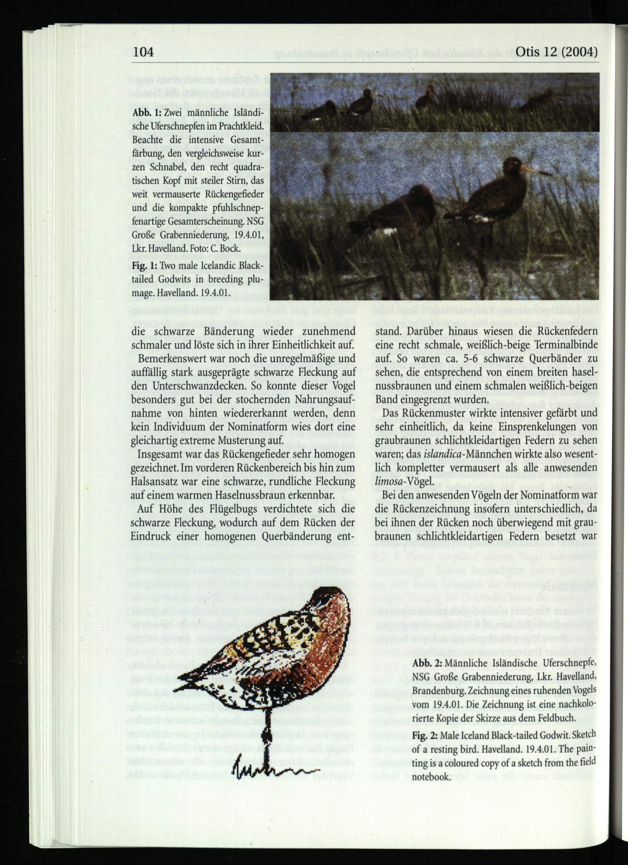 Abb. 1: Zwei männliche Isländische Uferschnepfen im Prachtkleid. Beachte die intensive Gesamtfärbung, den vergleichsweise kurzen Schnabel, den recht quadra-| tischen Kopf mit steiler Stirn, das| weit vermauserte Rückengefieder und die kompakte pfuhlschnepfenartige Gesamterscheinung. NSG Große Grabenniederung, 19.4.01, Lkr. Havelland. Foto: C. Bock.