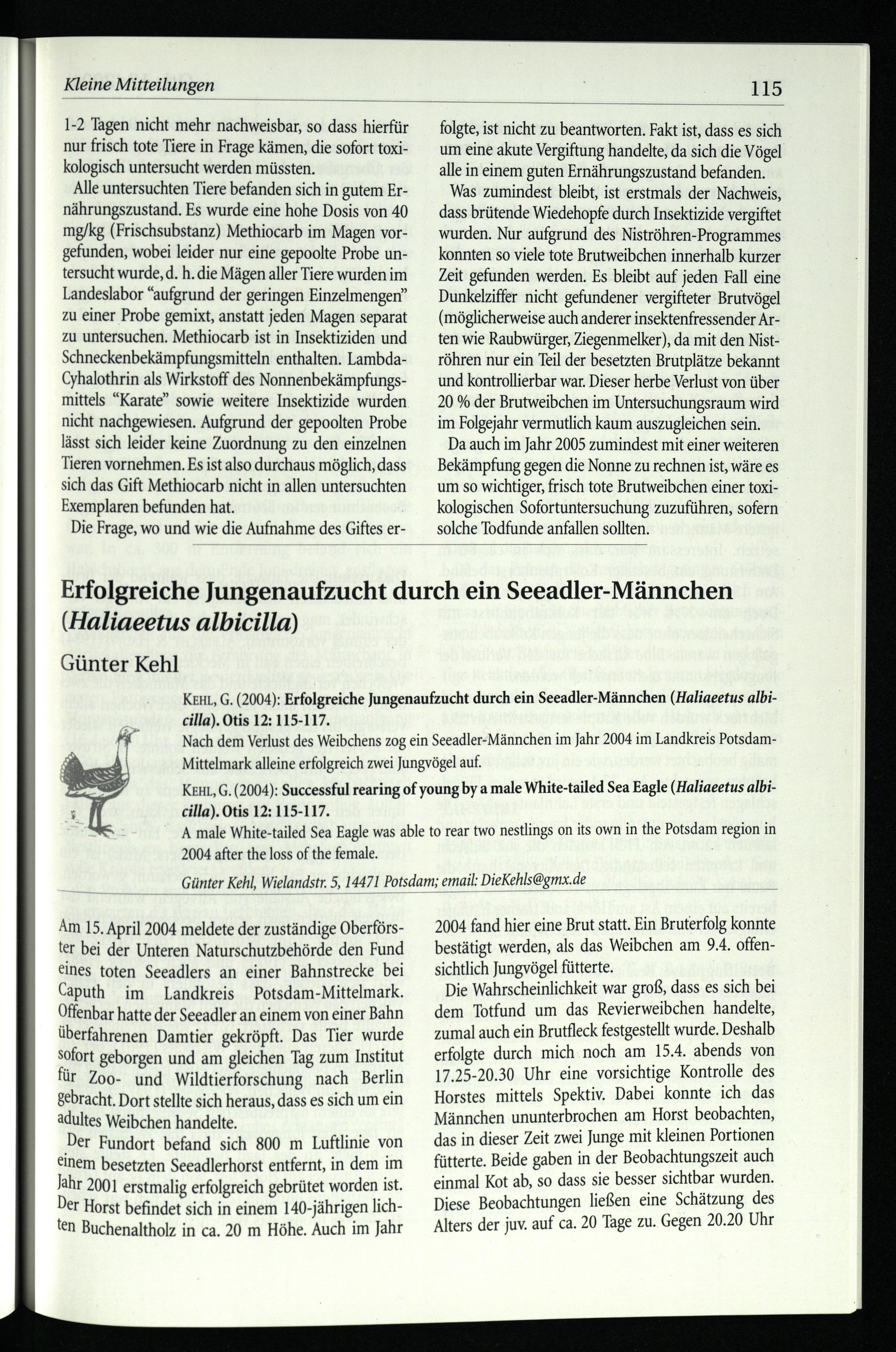 Nach dem Verlust des Weibchens zog ein Seeadler-Männchen im Jahr 2004 im Landkreis PotsdamMittelmark alleine erfolgreich zwei Jungvögel auf. KEHL , G.(2004): Successful rearing of young by a male White-tailed Sea Eagle(Haliaeetus albi