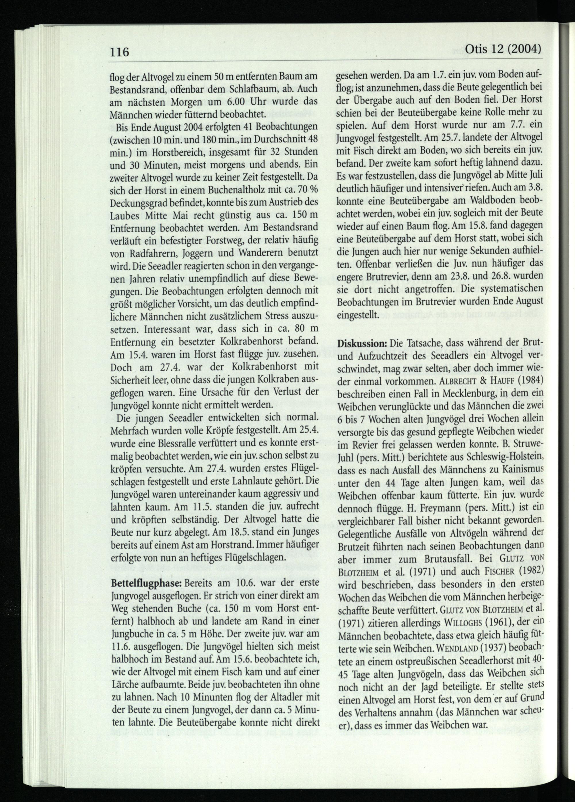 Bis Ende August 2004 erfolgten 41 Beobachtungen (zwischen 10 min. und 180 min., im Durchschnitt 48 min.) im Horstbereich, insgesamt für 32 Stunden und 30 Minuten, meist morgens und abends. Ein zweiter Altvogel wurde zu keiner Zeit festgestellt. Da sich der Horst in einem Buchenaltholz mit ca. 70% Deckungsgrad befindet, konnte bis zum Austrieb des Laubes Mitte Mai recht günstig aus ca. 150 m Entfernung beobachtet werden. Am Bestandsrand verläuft ein befestigter Forstweg, der relativ häufig von Radfahrern, Joggern und Wanderern benutzt wird. Die Seeadler reagierten schon in den vergangenen Jahren relativ unempfindlich auf diese Bewegungen. Die Beobachtungen erfolgten dennoch mit größt möglicher Vorsicht, um das deutlich empfindlichere Männchen nicht zusätzlichem Stress auszusetzen. Interessant war, dass sich in ca. 80 m Entfernung ein besetzter Kolkrabenhorst befand. Am 15.4. waren im Horst fast flügge juv. zusehen. Doch am 27.4. war der Kolkrabenhorst mit Sicherheit leer, ohne dass die jungen Kolkraben ausgeflogen waren. Eine Ursache für den Verlust der Jungvögel konnte nicht ermittelt werden.