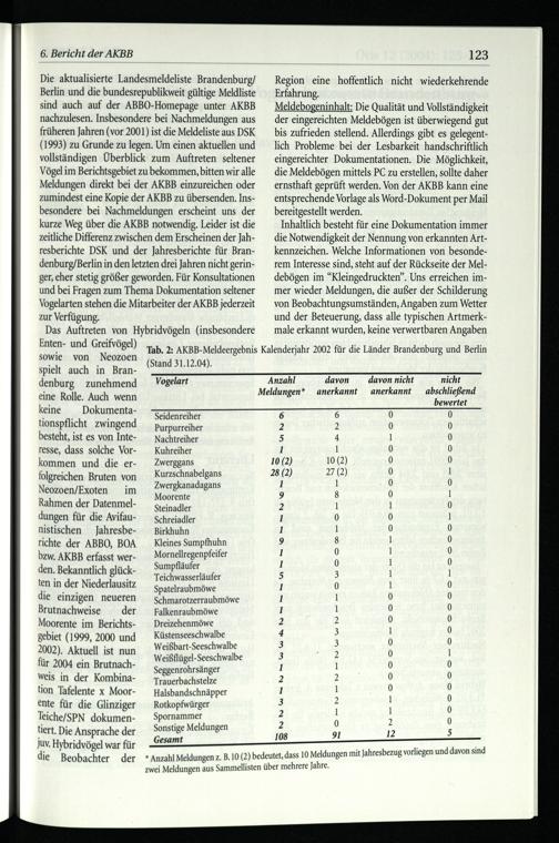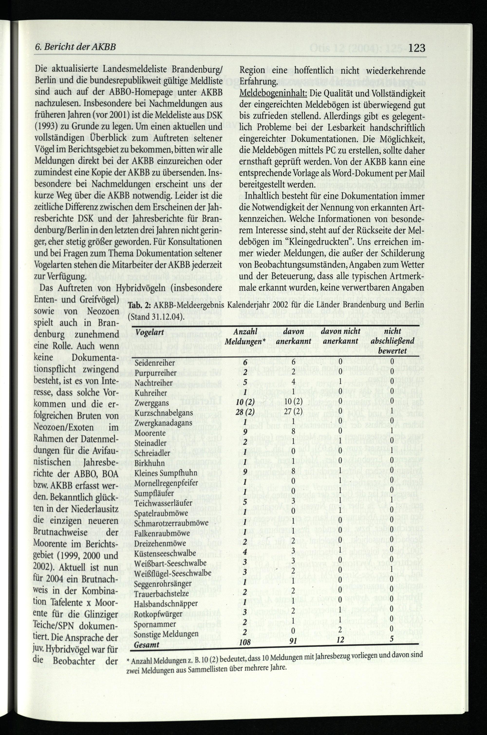Die aktualisierte Landesmeldeliste Brandenburg / Berlin und die bundesrepublikweit gültige Meldliste sind auch auf der ABBO-Homepage unter AKBB nachzulesen. Insbesondere bei Nachmeldungen aus früheren Jahren(vor 2001) ist die Meldeliste aus DSK (1993) zu Grunde zu legen. Um einen aktuellen und vollständigen Überblick zum Auftreten seltener Vögel im Berichtsgebiet zu bekommen, bitten wir alle Meldungen direkt bei der AKBB einzureichen oder zumindest eine Kopie der AKBB zu übersenden. Insbesondere bei Nachmeldungen erscheint uns der kurze Weg über die AKBB notwendig. Leider ist die zeitliche Differenz zwischen dem Erscheinen der Jahresberichte DSK und der Jahresberichte für Bran denburg/Berlin in den letzten drei Jahren nicht geringer, eher stetig größer geworden. Für Konsultationen und bei Fragen zum Thema Dokumentation seltener Vogelarten stehen die Mitarbeiter der AKBB jederzeit zur Verfügung.
