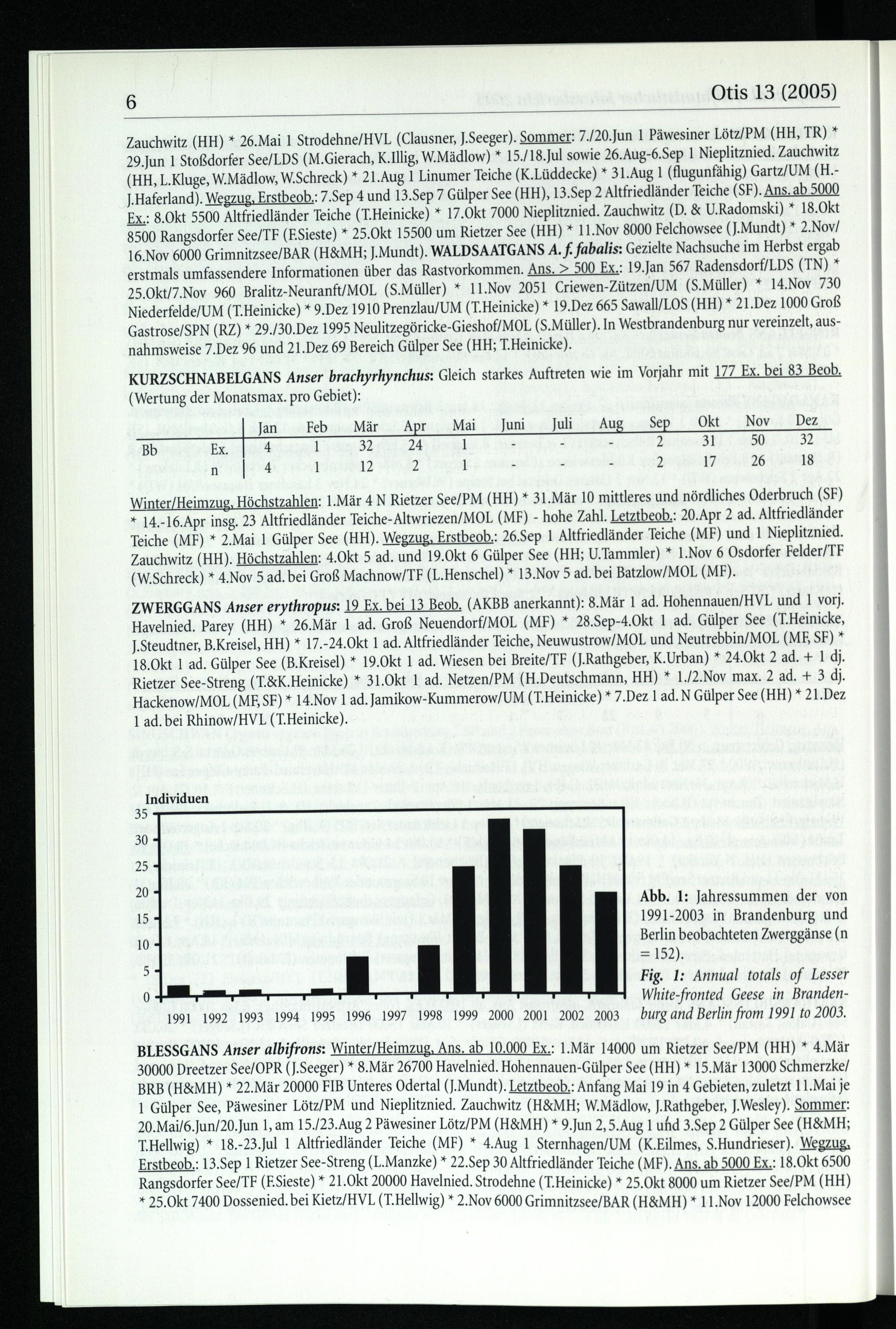 Individuen 35 30 25 20 Abb. 1: Jahressummen der von 15 1991-2003 in Brandenburg und 10 Berlin beobachteten Zwerggänse(n ;= 152). Fig. 1: Annual totals of Lesser 0 White-fronted Geese in Branden