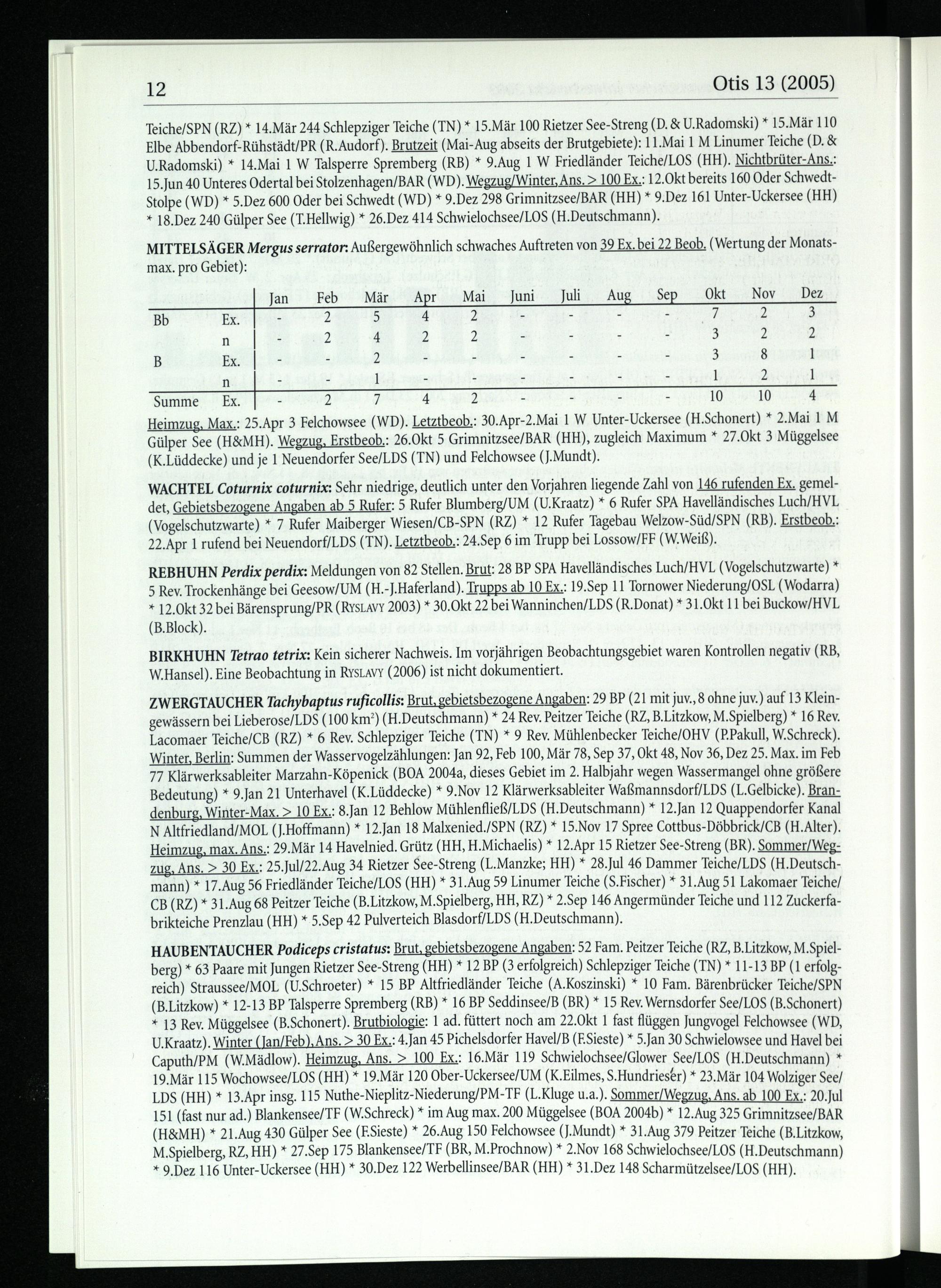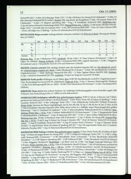 HAUBENTAUCHER Podiceps cristatus: Brut, gebietsbezogene Angaben: 52 Fam. Peitzer Teiche(RZ, B.Litzkow, M.Spielberg)* 63 Paare mit Jungen Rietzer See-Streng(HH )* 12 BP(3 erfolgreich) Schlepziger Teiche(TN)* 11-13 BP(1 erfolgreich) Straussee/MOL(U.Schroeter)* 15 BP Altfriedländer Teiche(A.Koszinski)* 10 Fam. Bärenbrücker Teiche/SPN (B.Litzkow)* 12-13 BP Talsperre Spremberg(RB)* 16 BP Seddinsee/B(BR )* 15 Rev. Wernsdorfer See/LOS(B.Schonert) * 13 Rev. Müggelsee(B.Schonert). Brutbiologie: 1 ad. füttert noch am 22.Okt 1 fast flüggen Jungvogel Felchowsee(WD, U.Kraatz). Winter(Jan/Feb), Ans.> 30 Ex.: 4.Jan 45 Pichelsdorfer Havel/B (ESieste)* 5.Jan 30 Schwielowsee und Havel bei Caputh/PM (W.Mädlow). Heimzug, Ans.> 100 Ex.: 16.Mär 119 Schwielochsee/Glower See/LOS(H.Deutschmann)* 19.Mär 115 Wochowsee/LOS(HH )* 19.Mär 120 Ober-Uckersee/UM(K.Eilmes, S.Hundrieser)* 23.Mär 104 Wolziger See/ LDS (HH )* 13.Apr insg. 115 Nuthe -Nieplitz-Niederung/PM-TF(L.Kluge u.a.). Sommer/Wegzug, Ans. ab 100 Ex.: 20.Jul 151(fast nur ad.) Blankensee/TF (W.Schreck)* im Aug max. 200 Müggelsee(BOA 2004b)* 12.Aug 325 Grimnitzsee/BAR (H&MH)* 21.Aug 430 Gülper See(ESieste)* 26.Aug 150 Felchowsee(J.Mundt)* 31.Aug 379 Peitzer Teiche(B.Litzkow, M.Spielberg, RZ, HH )* 27.Sep 175 Blankensee/TF(BR , M.Prochnow)* 2.Nov 168 Schwielochsee/LOS(H.Deutschmann) * 9.Dez 116 Unter-Uckersee(HH )* 30.Dez 122 Werbellinsee/BAR(HH )* 31.Dez 148 Scharmützelsee/LOS(HH ).