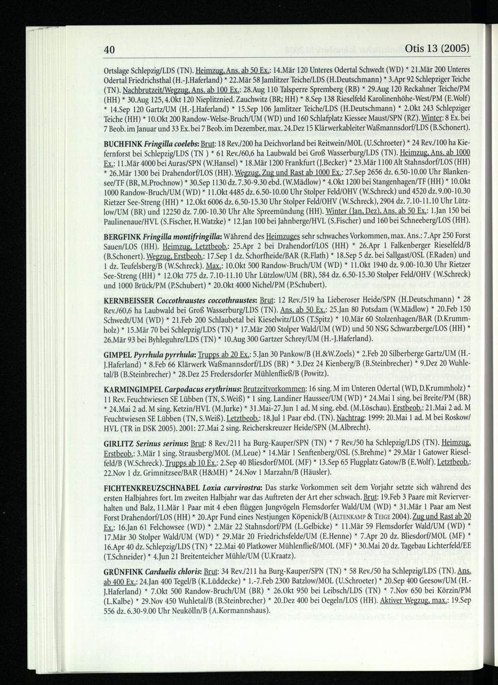 BUCHFINK Fringilla coelebs: Brut: 18 Rev./200 ha Deichvorland bei Reitwein/MOL (U.Schroeter)* 24 Rev./100 ha Kie­fernforst bei Schlepzig/LDS (TN)* 61 Rev./60,6 ha Laubwald bei Groß Wasserburg/LDS (TN). Heimzug, Ans. ab 1000 Ex.: 11.Mär 4000 bei Auras/SPN (W.Hansel)* 18.Mär 1200 Frankfurt (J.Becker)* 23.Mär 1100 Alt Stahnsdorf/LOS(HH) * 26.Mär 1300 bei Drahendorf/LOS(HH). Wegzug, Zug und Rast ab 1000 Ex.: 27.Sep 2656 dz. 6.50-10.00 Uhr Blanken­ see/TF (BR , M.Prochnow)* 30.Sep 1130 dz. 7.30-9.30 ebd.(W.Mädlow)* 4.Okt 1200 bei Stangenhagen/TF (HH )* 10.Okt 1000 Randow-Bruch/UM(WD)* 11.Okt 4485 dz. 6.50-10.00 Uhr Stolper Feld/OHV (W.Schreck) und 4520 dz. 9.00-10.30 Rietzer See-Streng(HH )* 12.Okt 6006 dz. 6.50-15.30 Uhr Stolper Feld/OHV (W.Schreck), 2904 dz. 7.10-11.10 Uhr Lütz­low/UM(BR ) und 12250 dz. 7.00-10.30 Uhr Alte Spreemündung(HH). Winter(Jan, Dez), Ans. ab 50 Ex.: 1.Jan 150 bei Paulinenaue/HVL (S.Fischer , H.Watzke)* 12.Jan 100 bei Jahnberge/HVL (S.Fischer ) und 160 bei Schneeberg/LOS (HH).